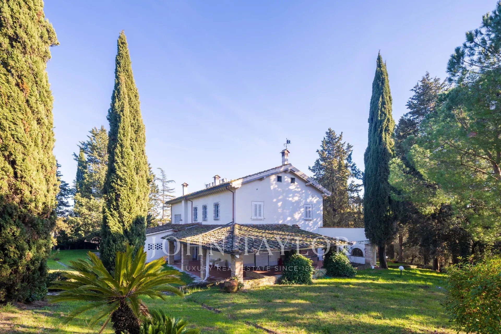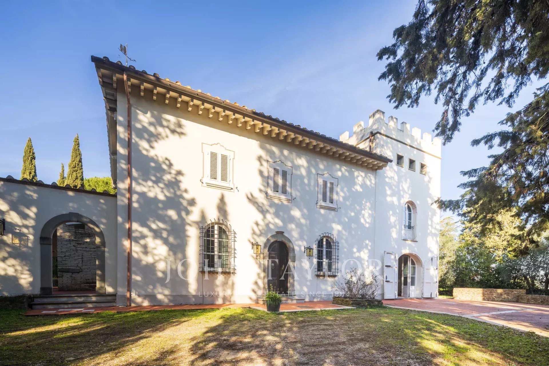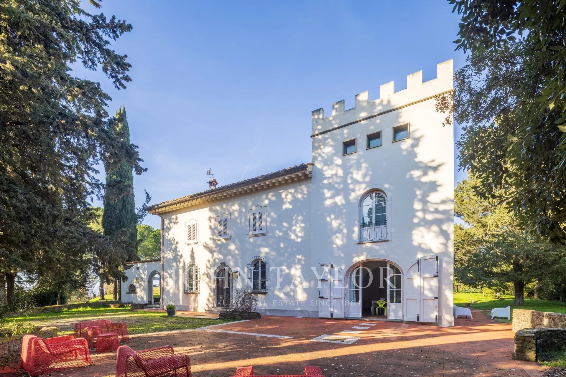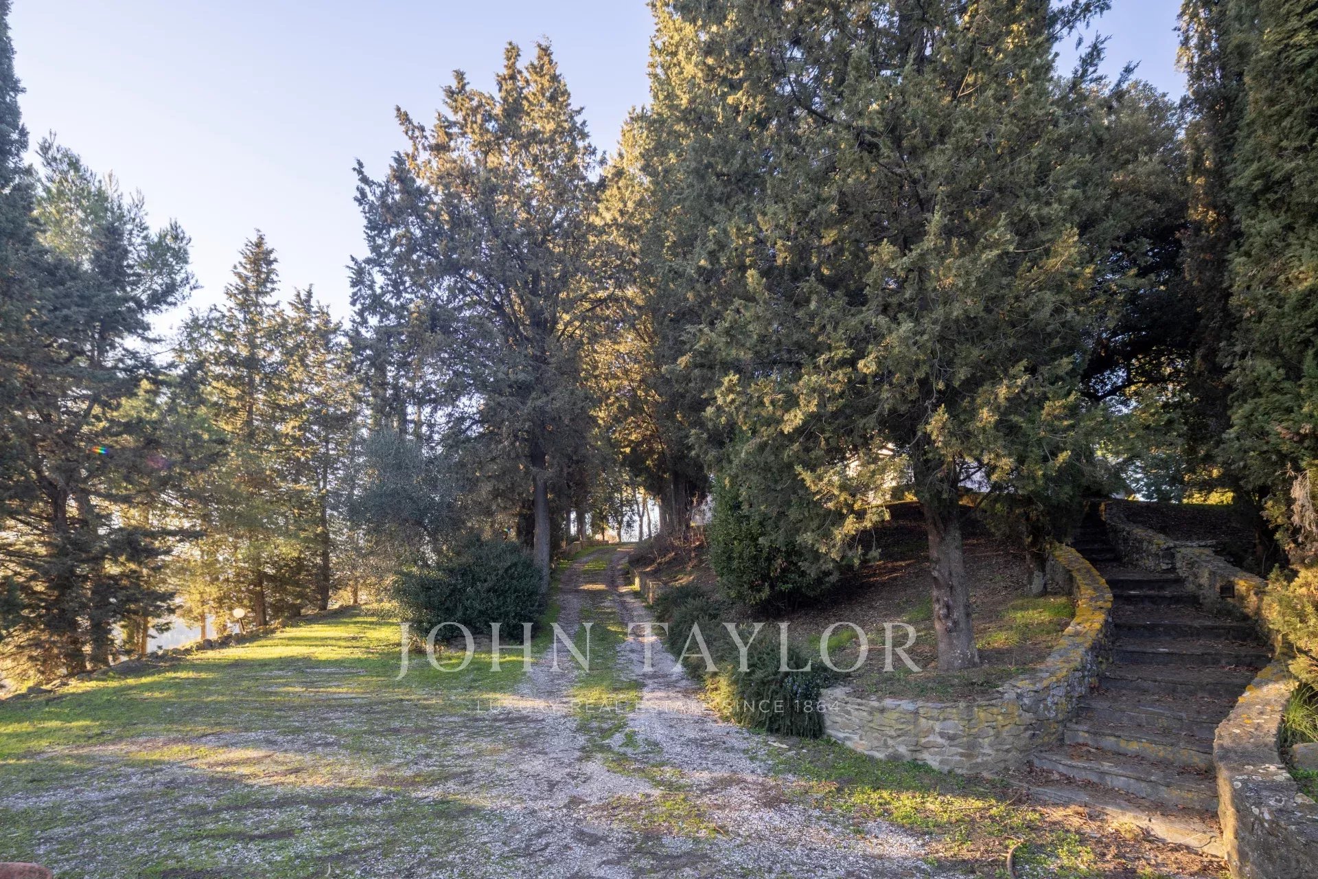 Вилла располагает великолепным парком, восхитительным бассейном с панорамным видом на виноградники и оливковые рощи, а также частным любительским теннисным кортом.
