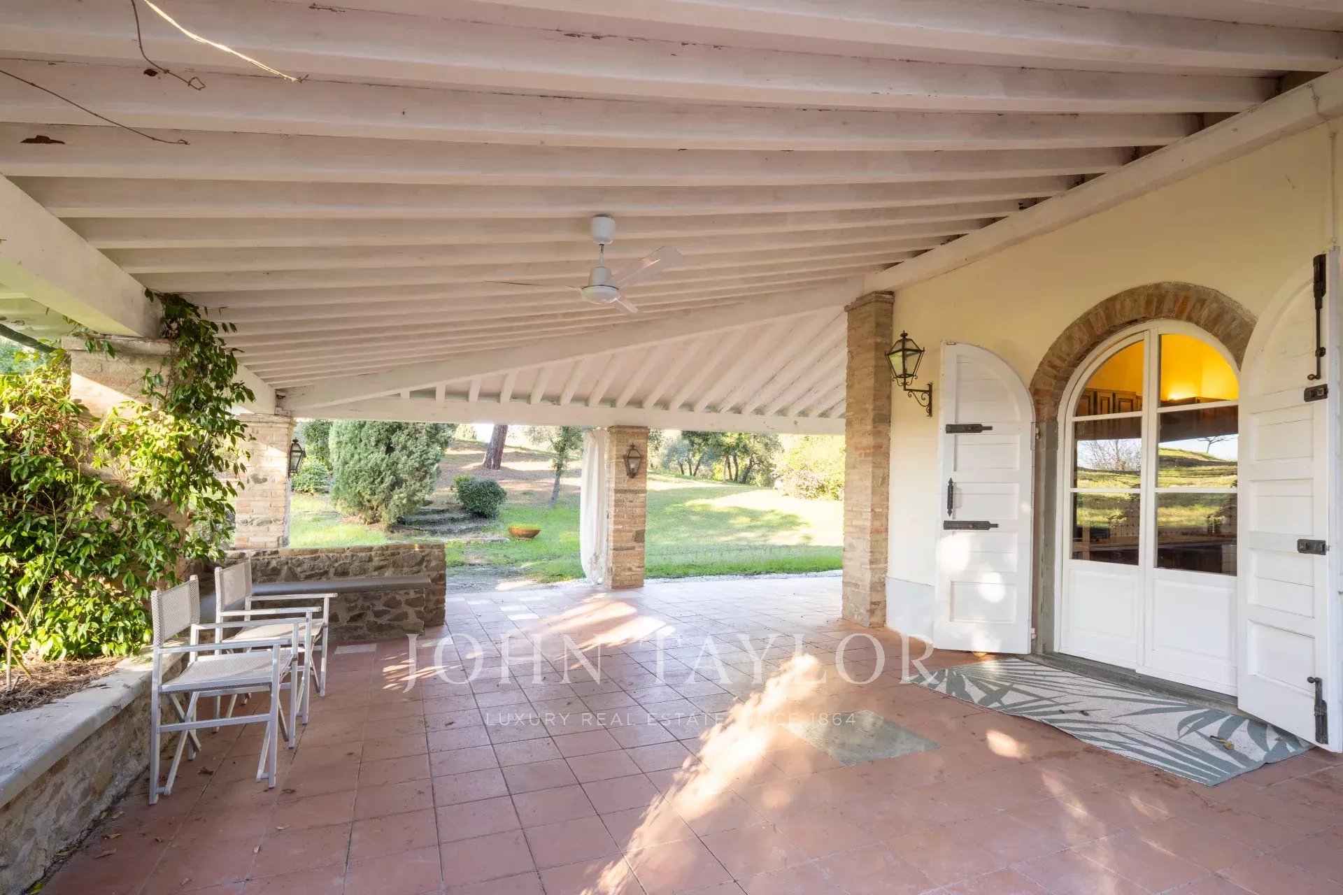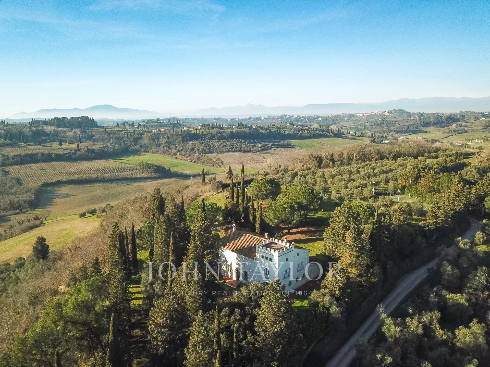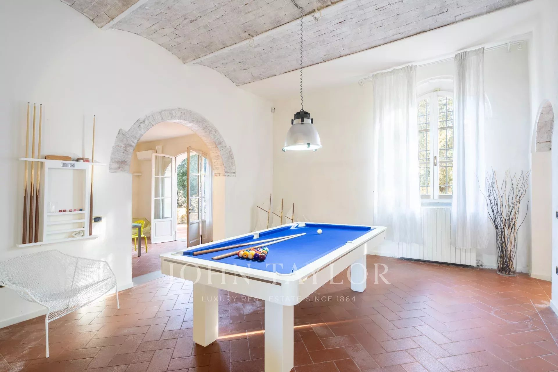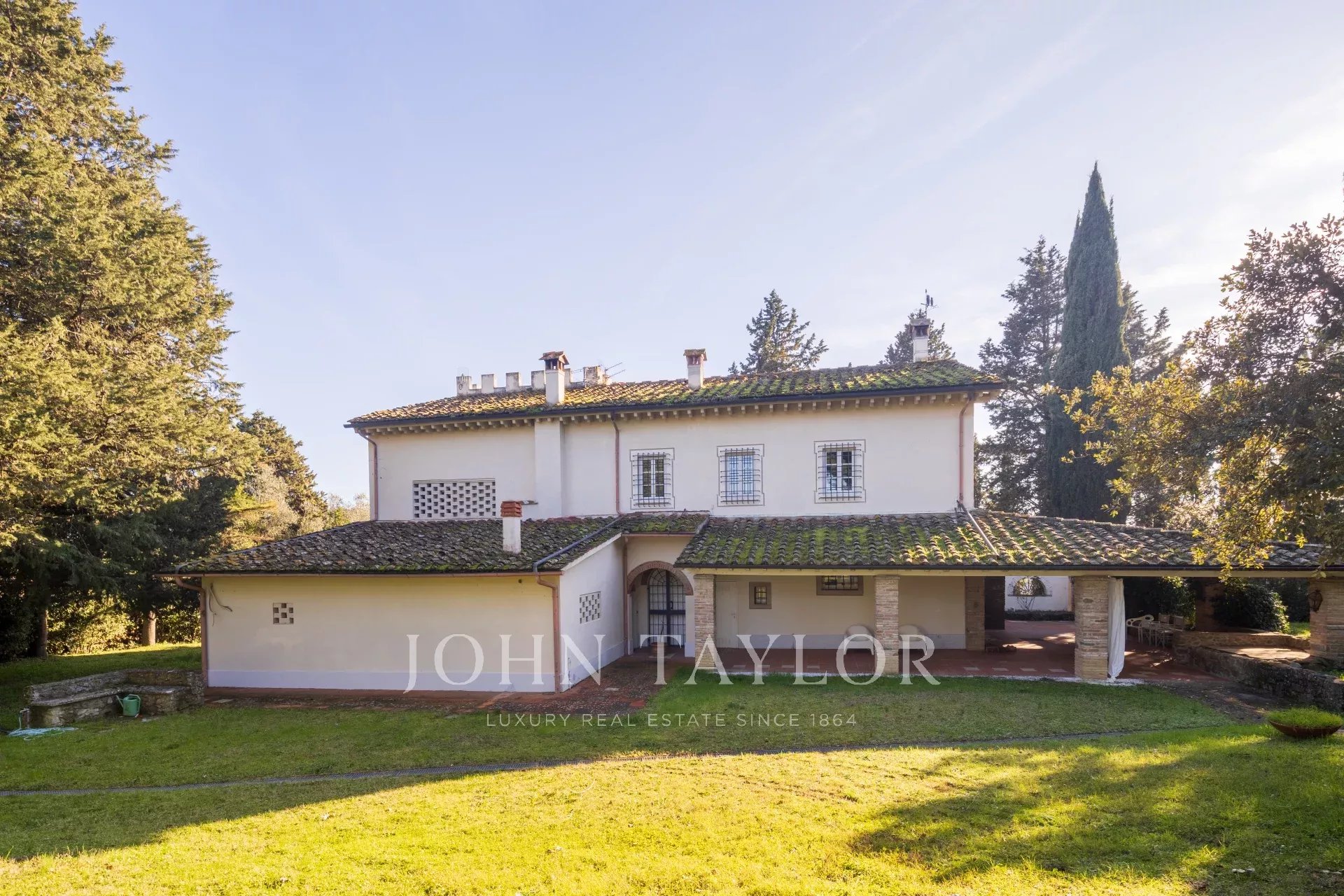 Вилла располагает великолепным парком, восхитительным бассейном с панорамным видом на виноградники и оливковые рощи, а также частным любительским теннисным кортом.