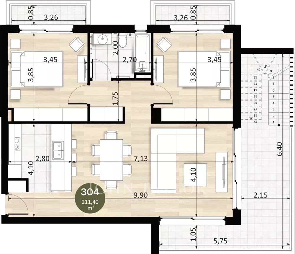 Для тех, кто ищет больше уединения и пространства на открытом воздухе, две оставшиеся виллы предлагают отдельные дома с ландшафтным садом, террасами на крыше и возможностью установки частного бассейна. Эти дома с пятью спальнями отличаются еще более высокими потолками, индивидуальными интерьерами и передовой системой кондиционирования VRV, а также полами с подогревом. Виллы, предназначенные для семейной жизни, включают в себя большие жилые помещения открытой планировки и частную парковку, но при этом имеют доступ к общим удобствам комплекса.