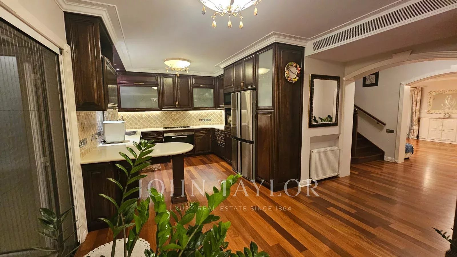 На первом этаже уложен пол из натурального бразильского дерева кумару, а верхний этаж отделан теплой пробкой. Вся мебель изготовлена из массива дерева, а светильники привезены из Италии, что придает дому изысканность. Комфорт дополняют система кондиционирования воздуха и газовая система отопления, распределенная через тринадцать радиаторов.