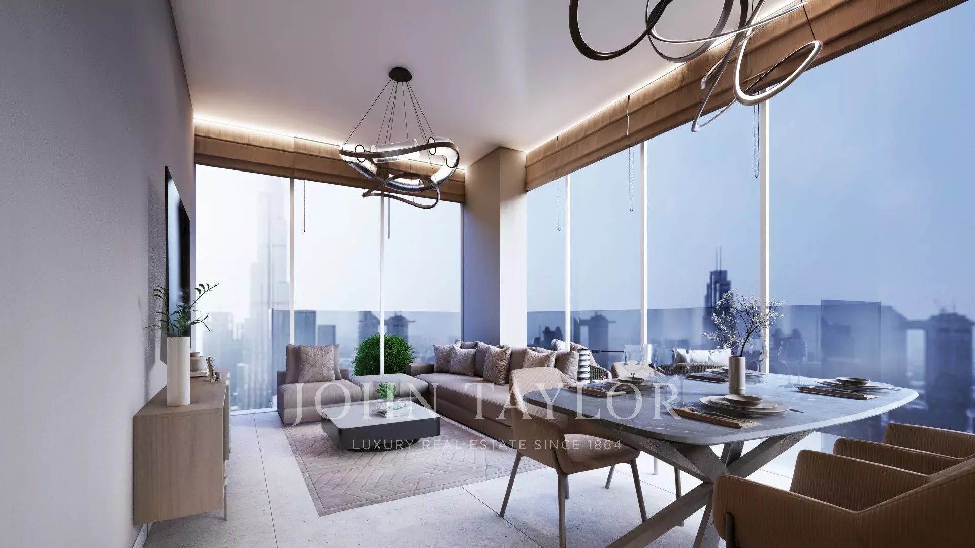 Гостиная и столовая открытой планировки: Просторная гостиная и столовая открытой концепции с окнами от пола до потолка, обеспечивающими достаточное количество естественного света и захватывающий вид на оживленную линию горизонта Даунтауна.