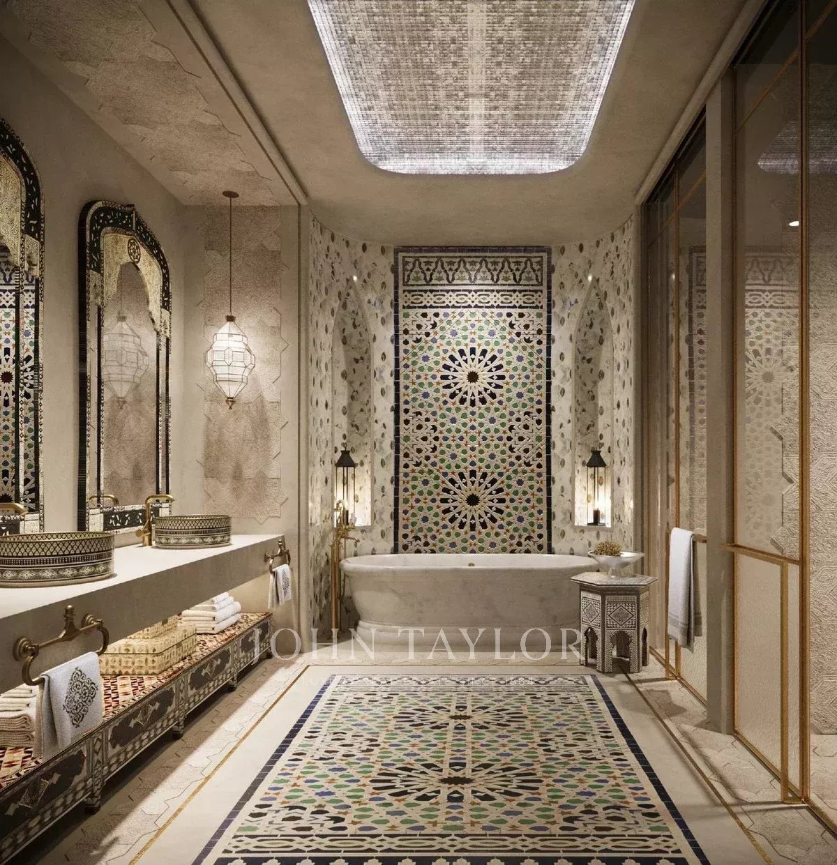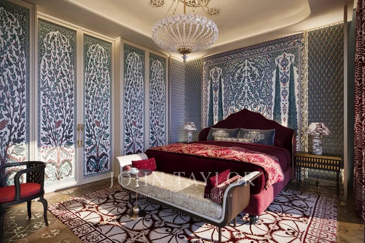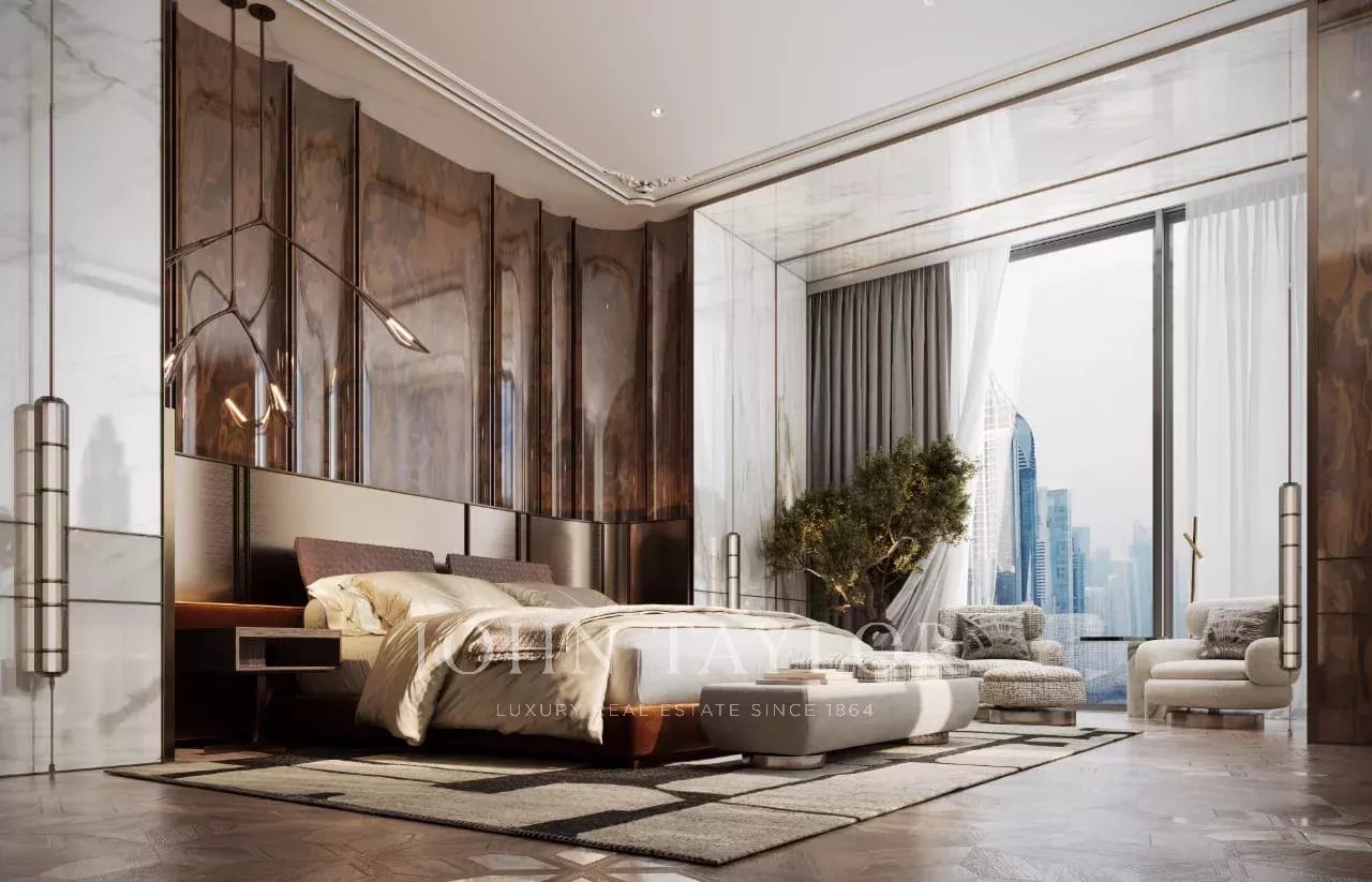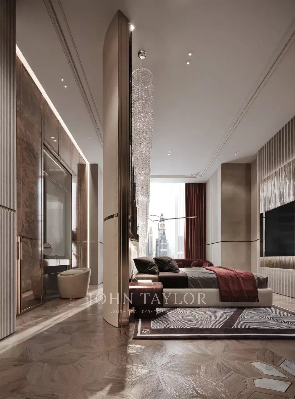 Мастер-люкс: Роскошная главная спальня с собственной ванной комнатой, гардеробной и панорамным видом на горизонт Дубая.