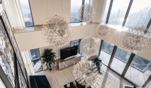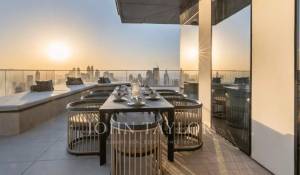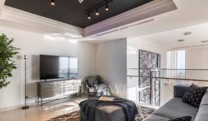 На верхнем этаже находится большая зона для приема гостей, к которой добавляется мини-кухня, а также огромная угловая терраса, с которой открывается панорамный вид, что делает квартиру непревзойденной для отдыха семьи и друзей.