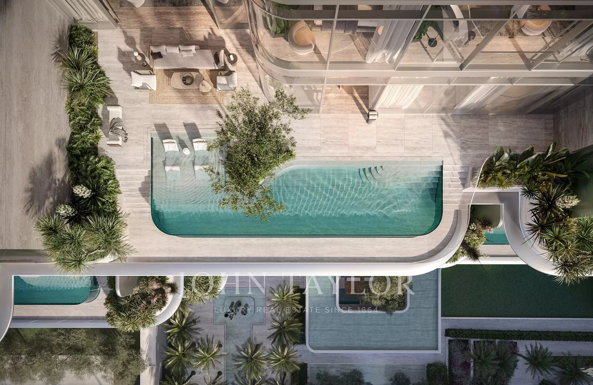 Отличительной особенностью дуплекса является обширная открытая терраса и палуба бассейна-инфинити. Частный бассейн достигает 18 м в длину и 3 м в ширину. Жильцы могут по своему усмотрению максимально использовать эту площадь в 2 921 кв. футов, чтобы разместить на ней обеденную зону на свежем воздухе, шезлонги и многое другое. Эта открытая зона плавно соединяется с кухней и столовой, что делает ее идеальным местом для приема гостей, наслаждаясь прекрасными видами на город и море.