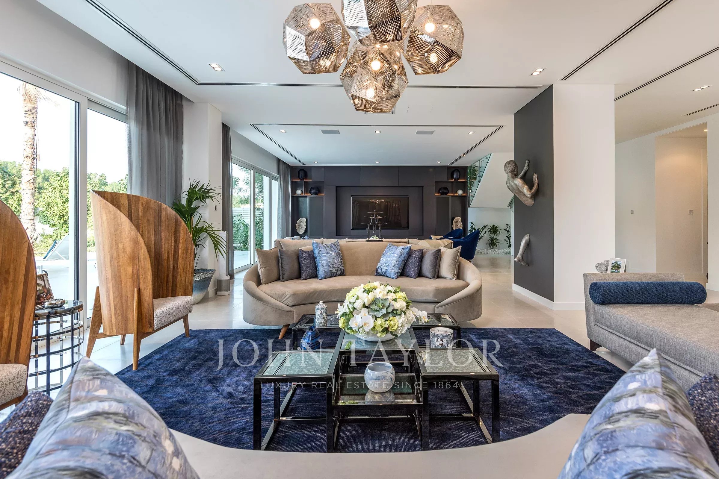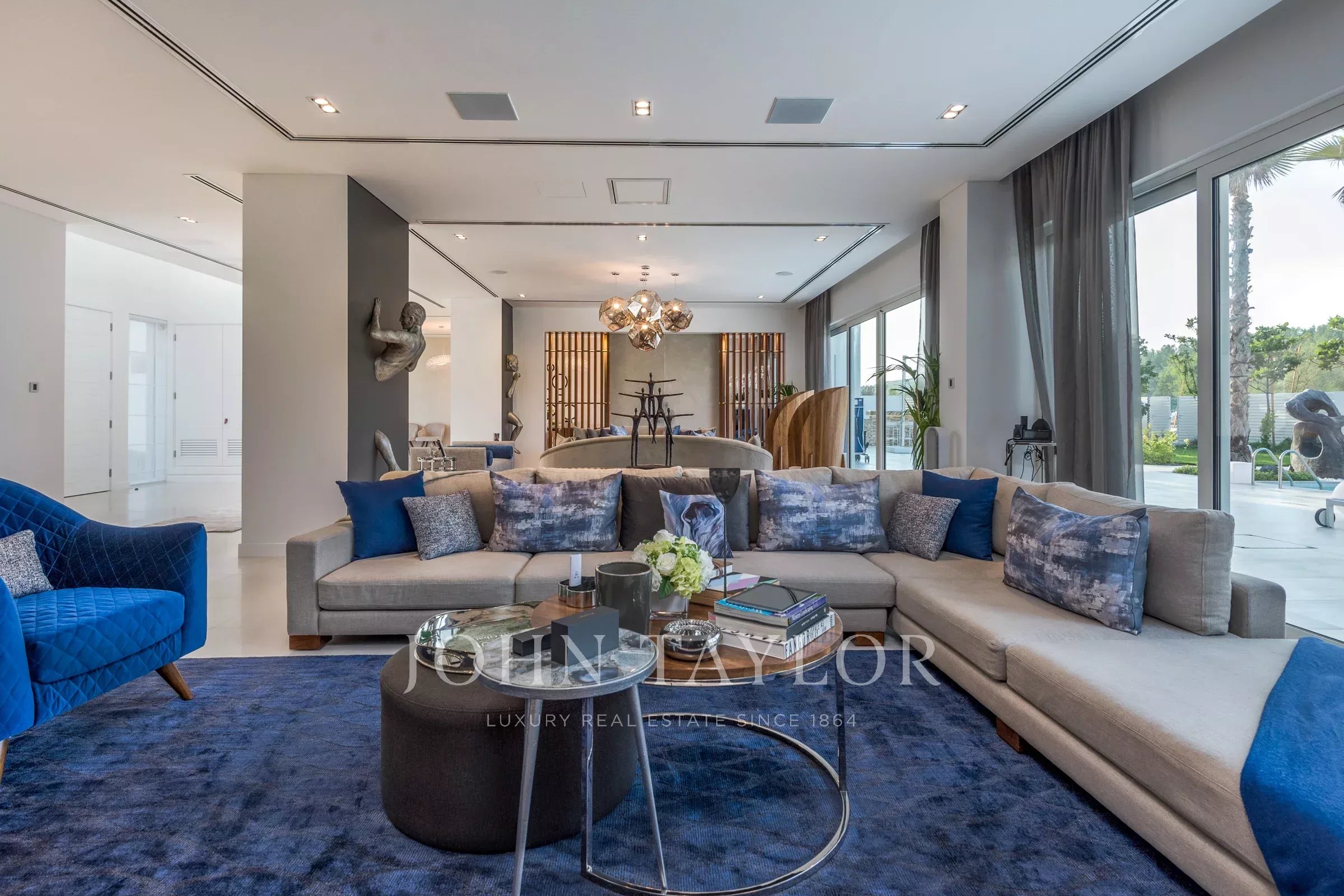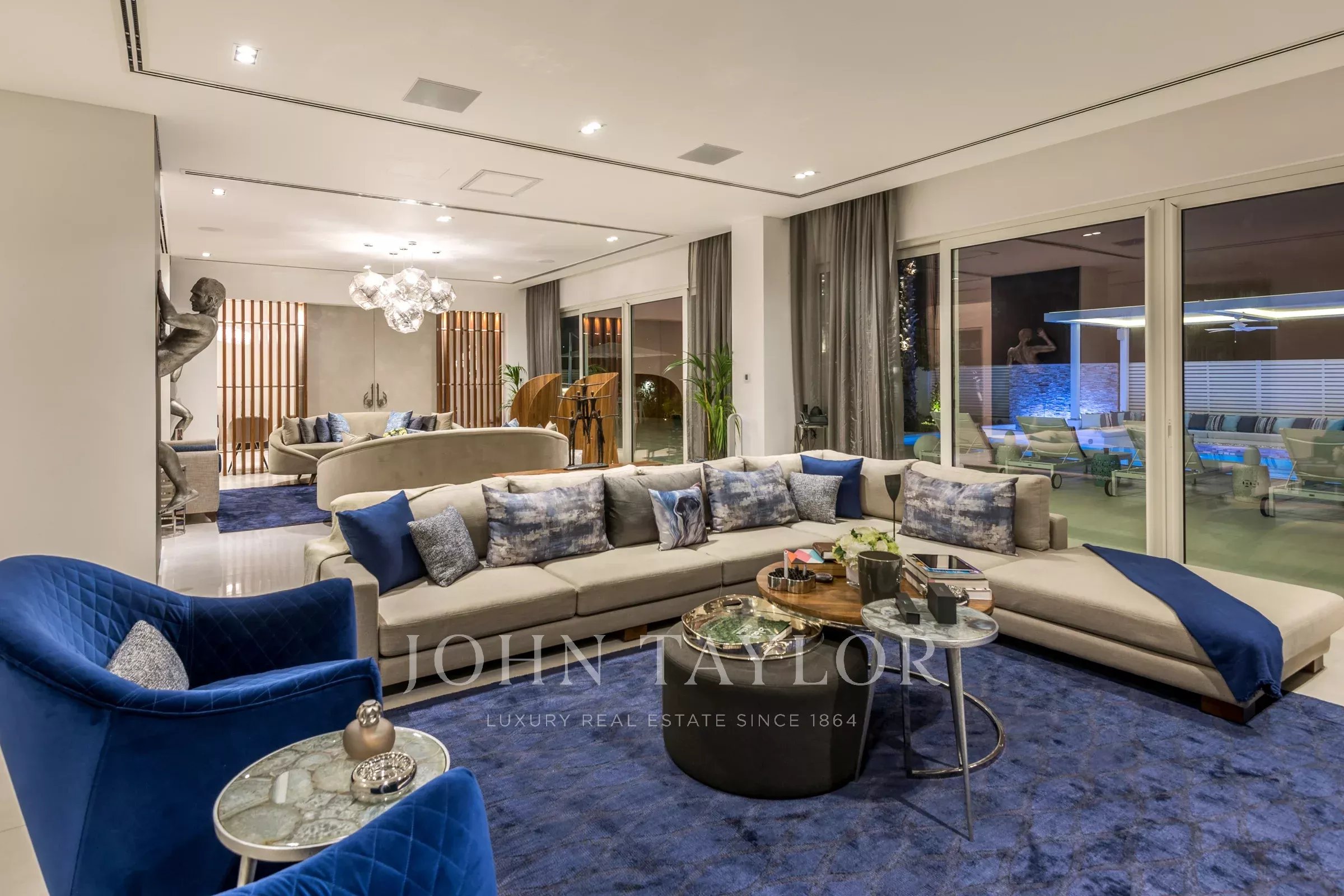 Вход с двойным световым куполом ведет вас в великолепную открытую гостиную с насыщенными синими и серебряными акцентами и произведениями искусства, которые служат центром для разговоров. Вторая гостиная выходит на открытый бассейн с зоной отдыха. В доме также есть просторная кухня. Планировка создана для того, чтобы впустить природу внутрь. Дом состоит из 5 просторных спален с собственными ванными комнатами, каждая из которых имеет свою уникальную индивидуальность; одна из них превращена в игровую комнату для детей. В главной спальне есть собственная зона отдыха с телевизором. Также есть огромная уличная зона отдыха с видом на бассейн.