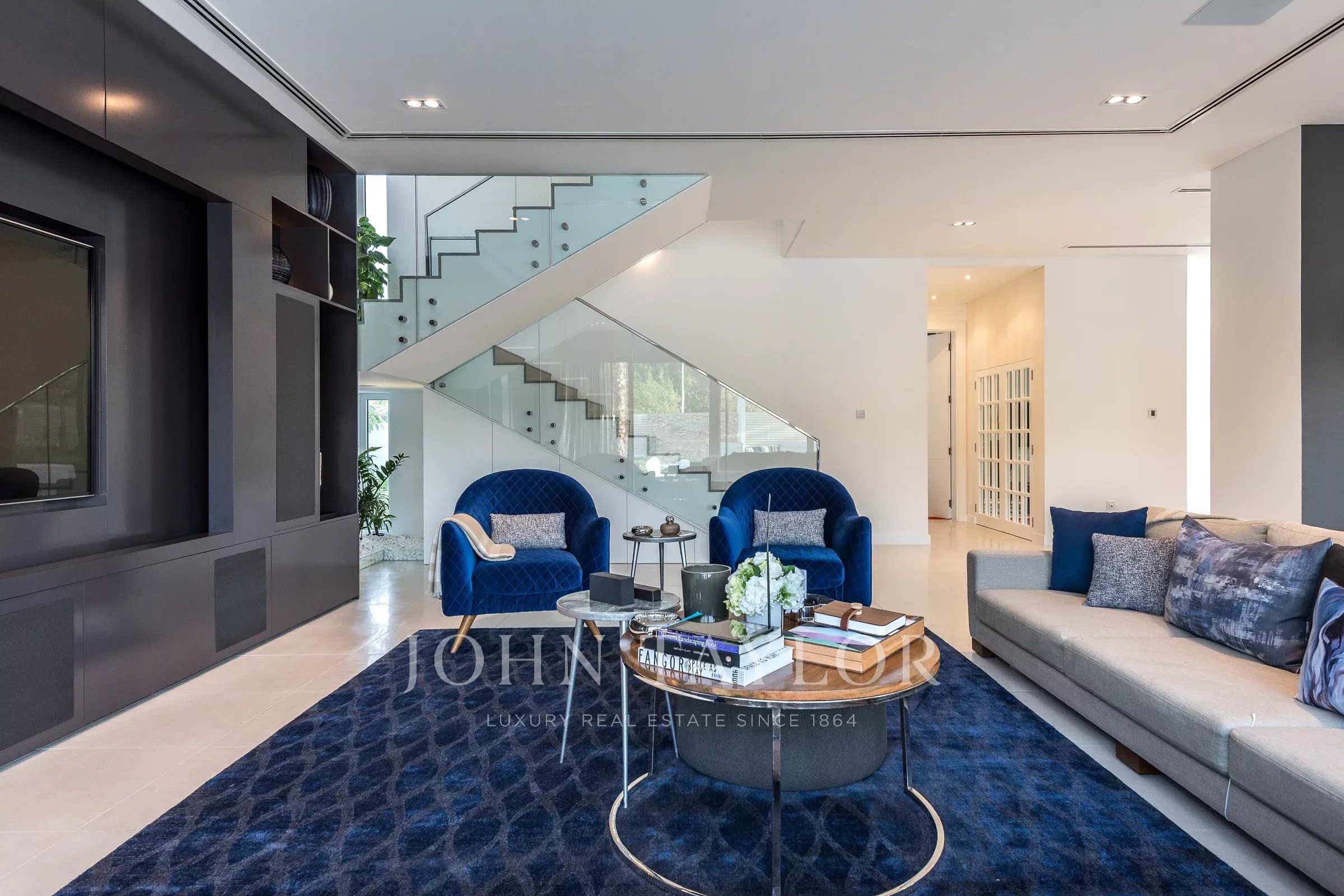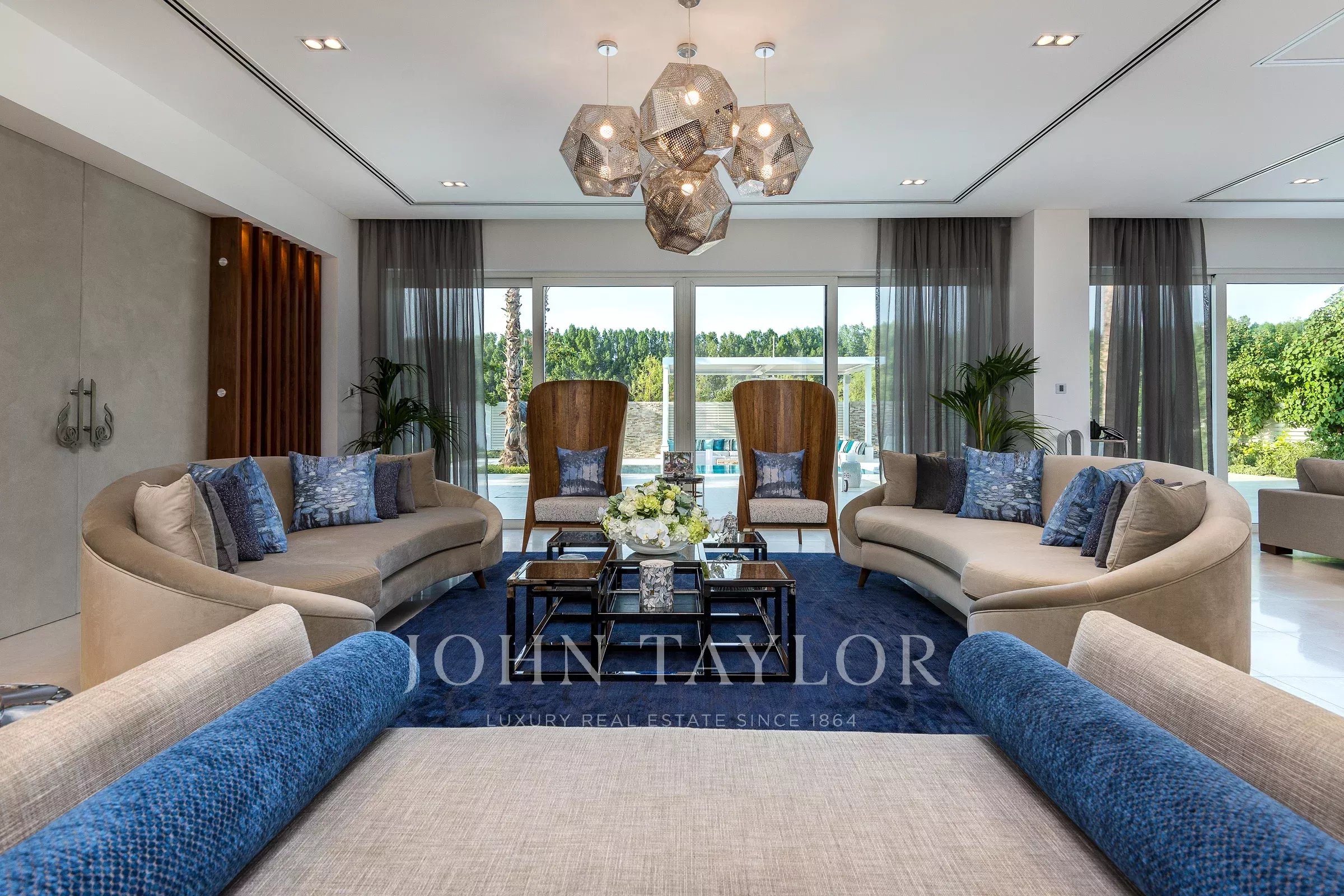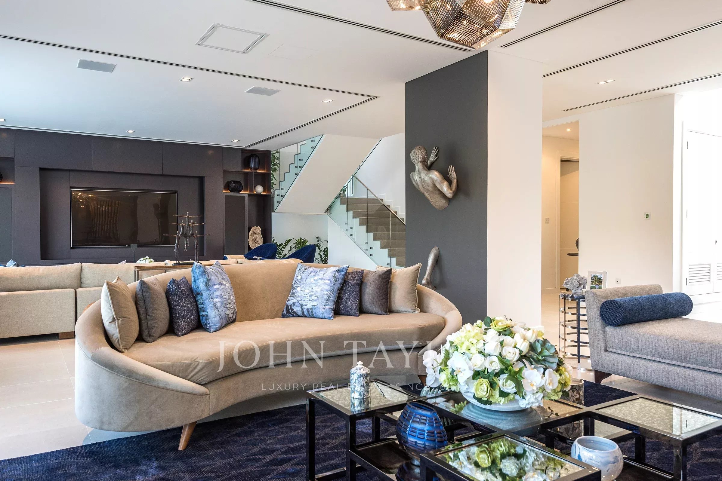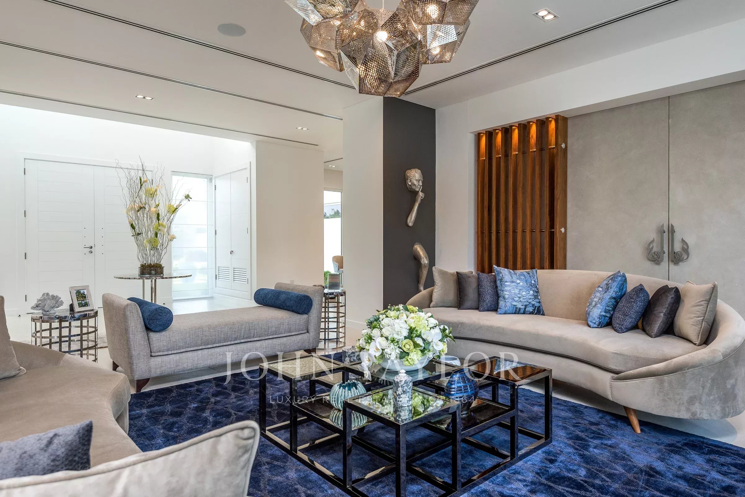 Вход с двойным световым куполом ведет вас в великолепную открытую гостиную с насыщенными синими и серебряными акцентами и произведениями искусства, которые служат центром для разговоров. Вторая гостиная выходит на открытый бассейн с зоной отдыха. В доме также есть просторная кухня. Планировка создана для того, чтобы впустить природу внутрь. Дом состоит из 5 просторных спален с собственными ванными комнатами, каждая из которых имеет свою уникальную индивидуальность; одна из них превращена в игровую комнату для детей. В главной спальне есть собственная зона отдыха с телевизором. Также есть огромная уличная зона отдыха с видом на бассейн.
