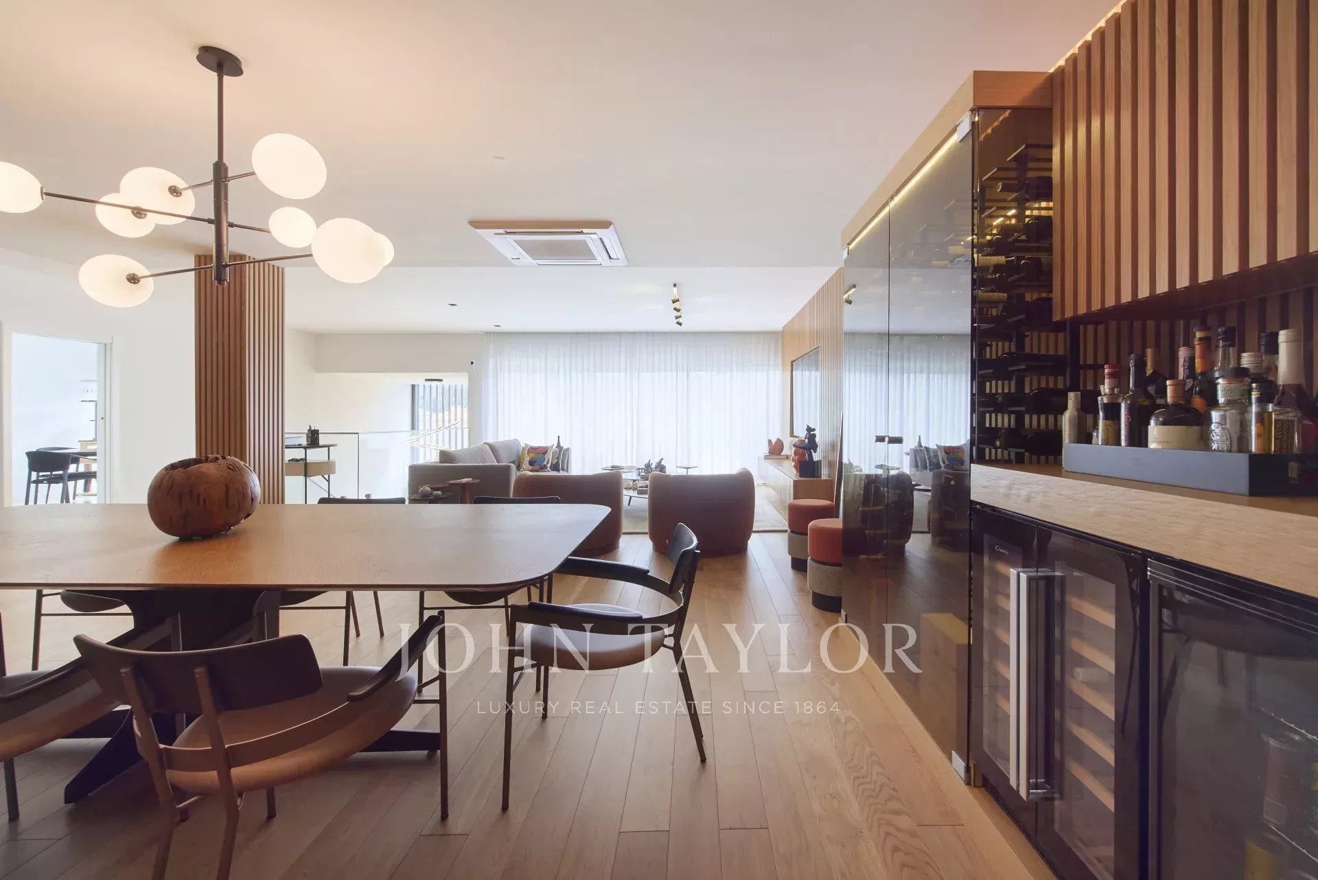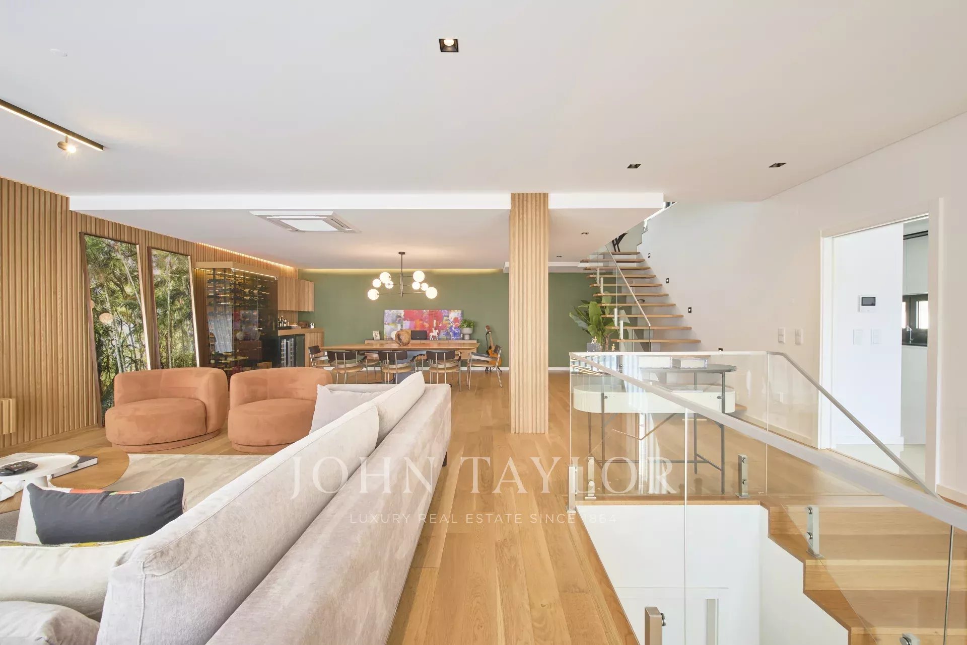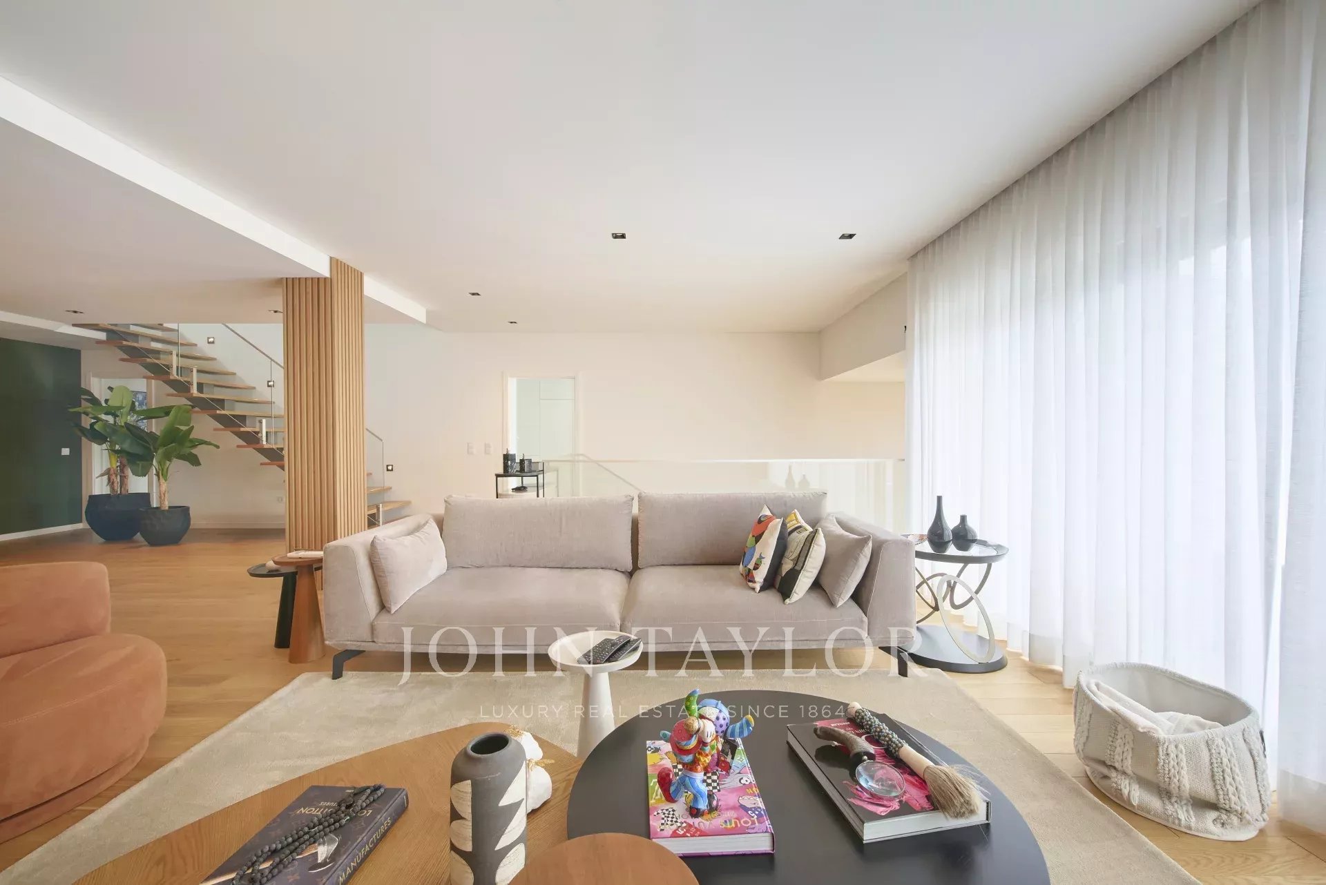На главном этаже расположены светлая гостиная открытой планировки и полностью оборудованная кухня с прямым выходом на большую террасу, идеально подходящую для обедов и развлечений на свежем воздухе.