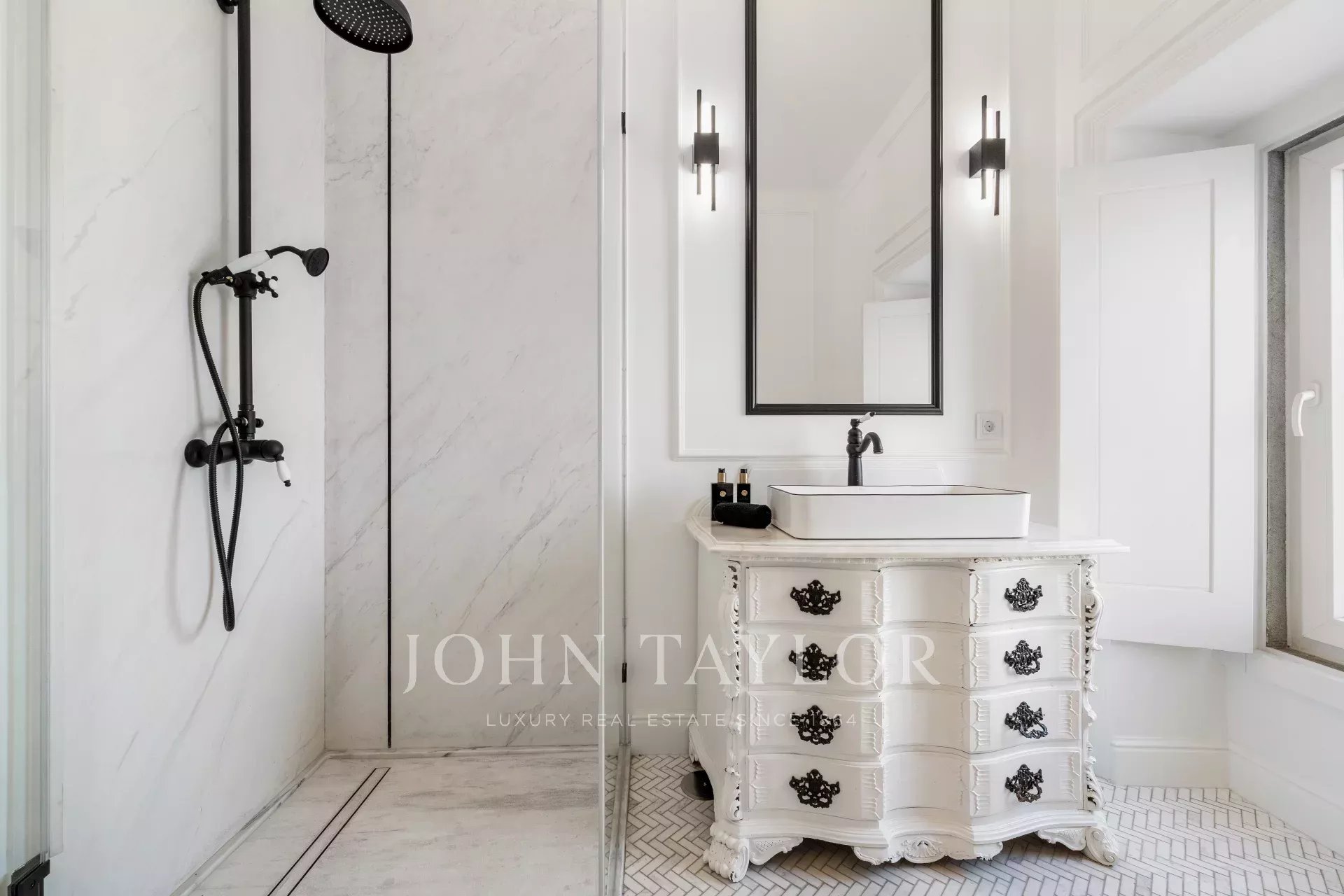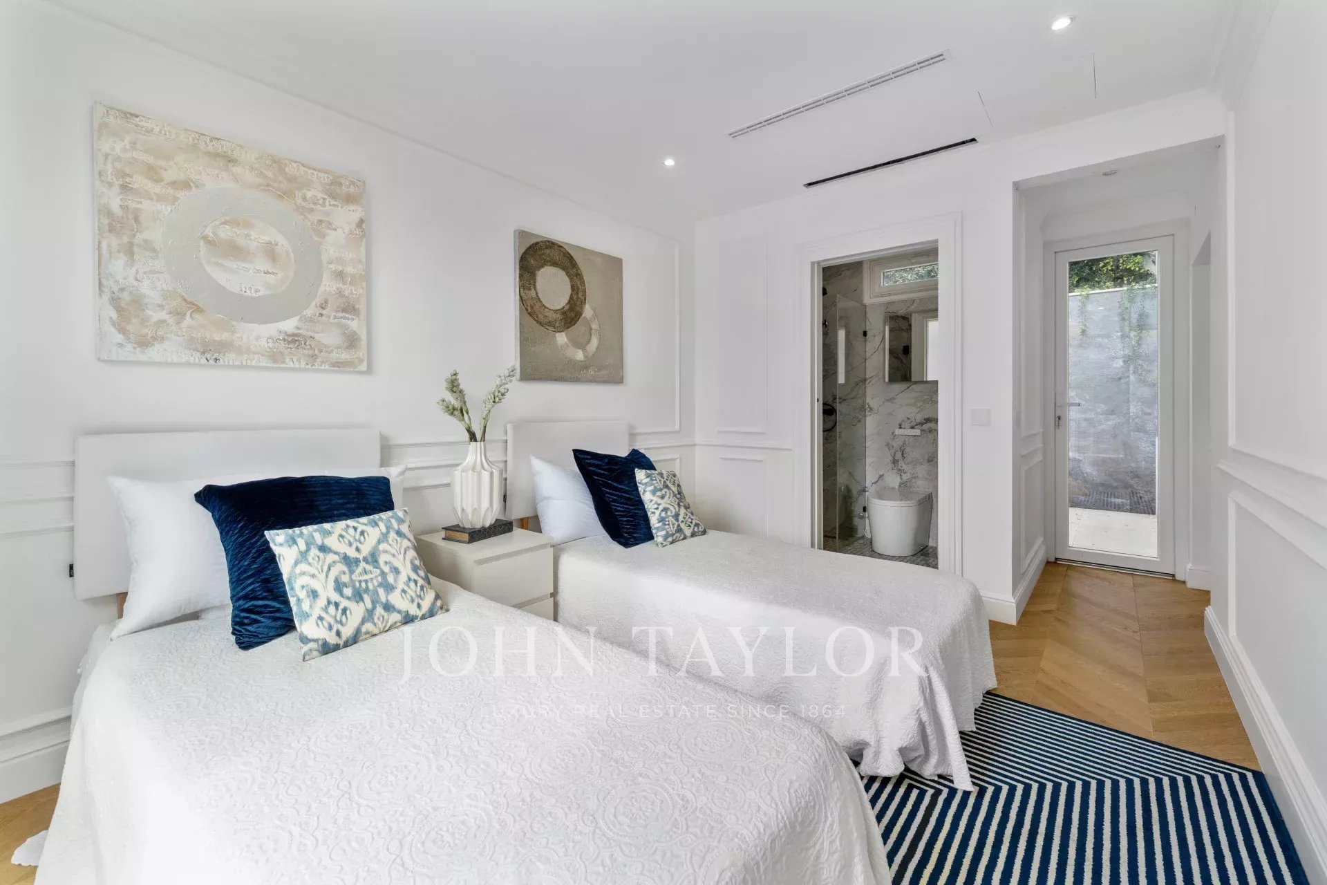На втором этаже расположены две большие спальни с ванными комнатами, обе с высокими потолками и стильными ванными комнатами, создающими комфортное и просторное личное пространство.