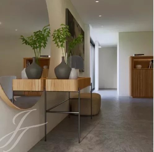 На первом этаже находится гостиная, полностью оборудованная кухня открытого плана с прямым выходом в сад и к бассейну. На этом же этаже находится офис, гостевой туалет и 3 спальни с ванными комнатами и встроенными шкафами.