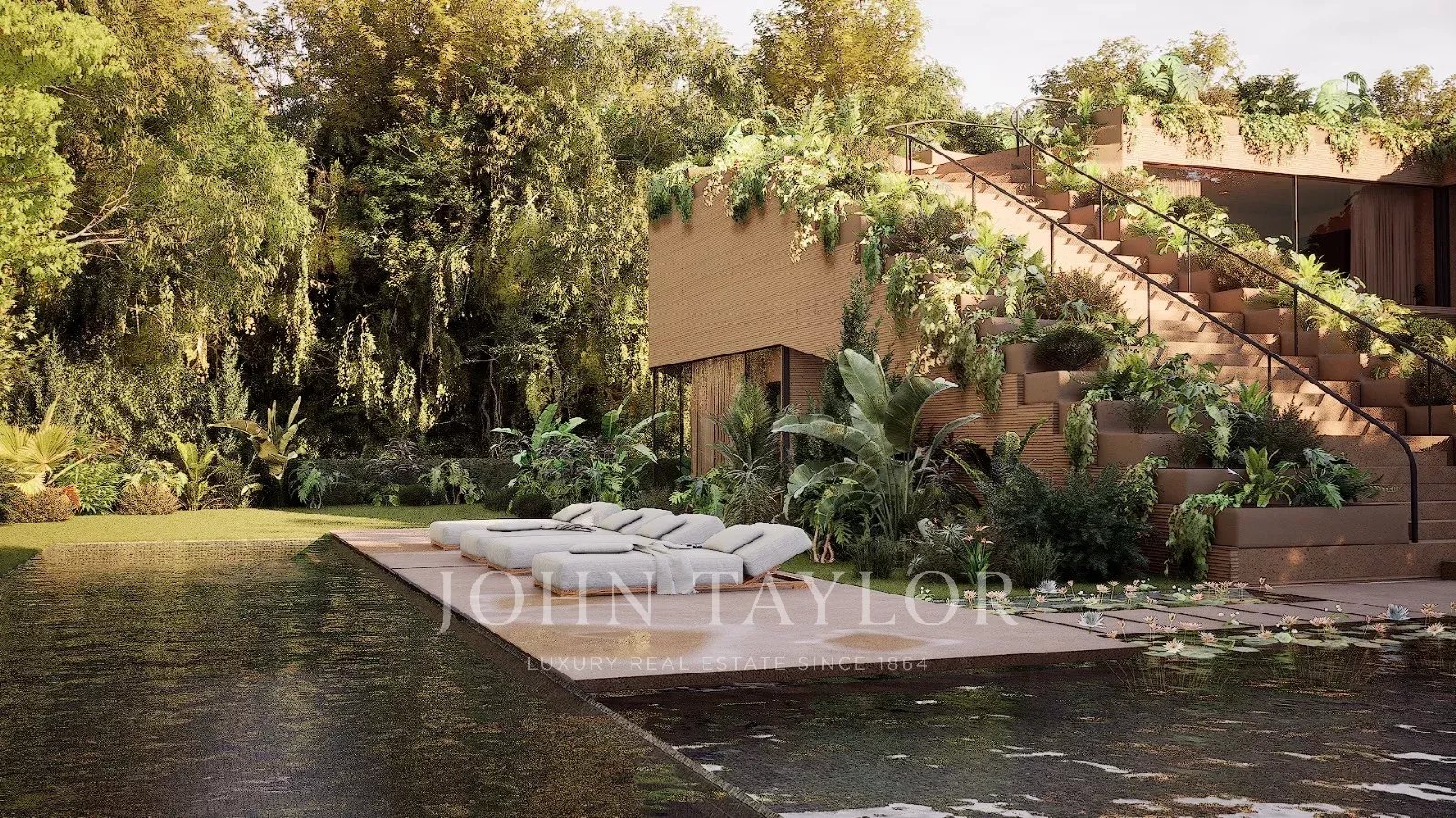 На первом этаже большая гостиная площадью более 90 кв. м разделена на три взаимосвязанные, но разные зоны, создавая плавное и уютное пространство. Столовая, рассчитанная на 12 человек, идеально подходит для приема гостей, а главная кухня с центральным островом - для общения. Полностью оборудованная вспомогательная кухня дополняет пространство, а также гостевые апартаменты, которые гарантируют комфорт и уединение.