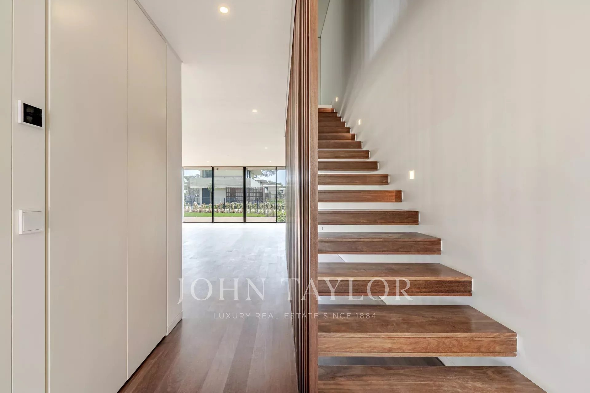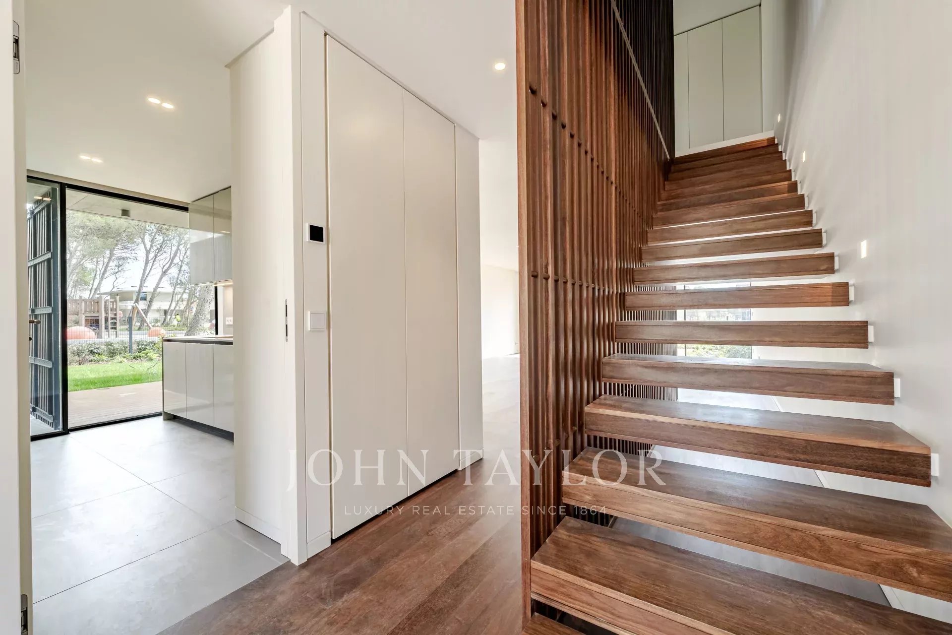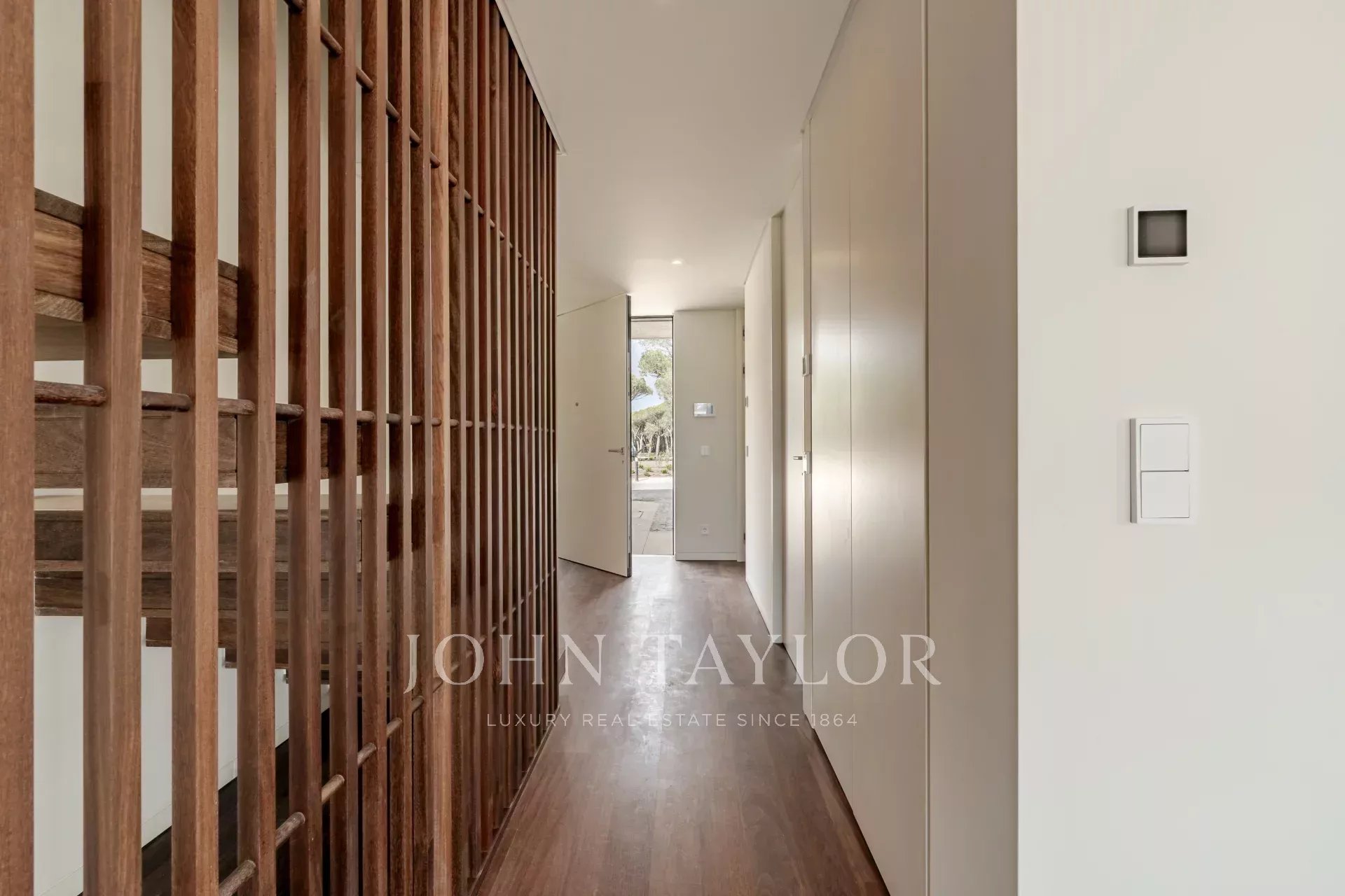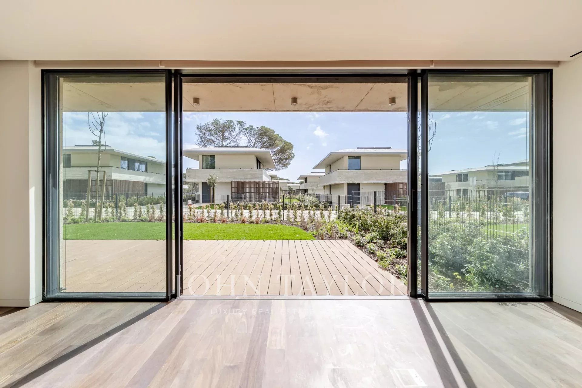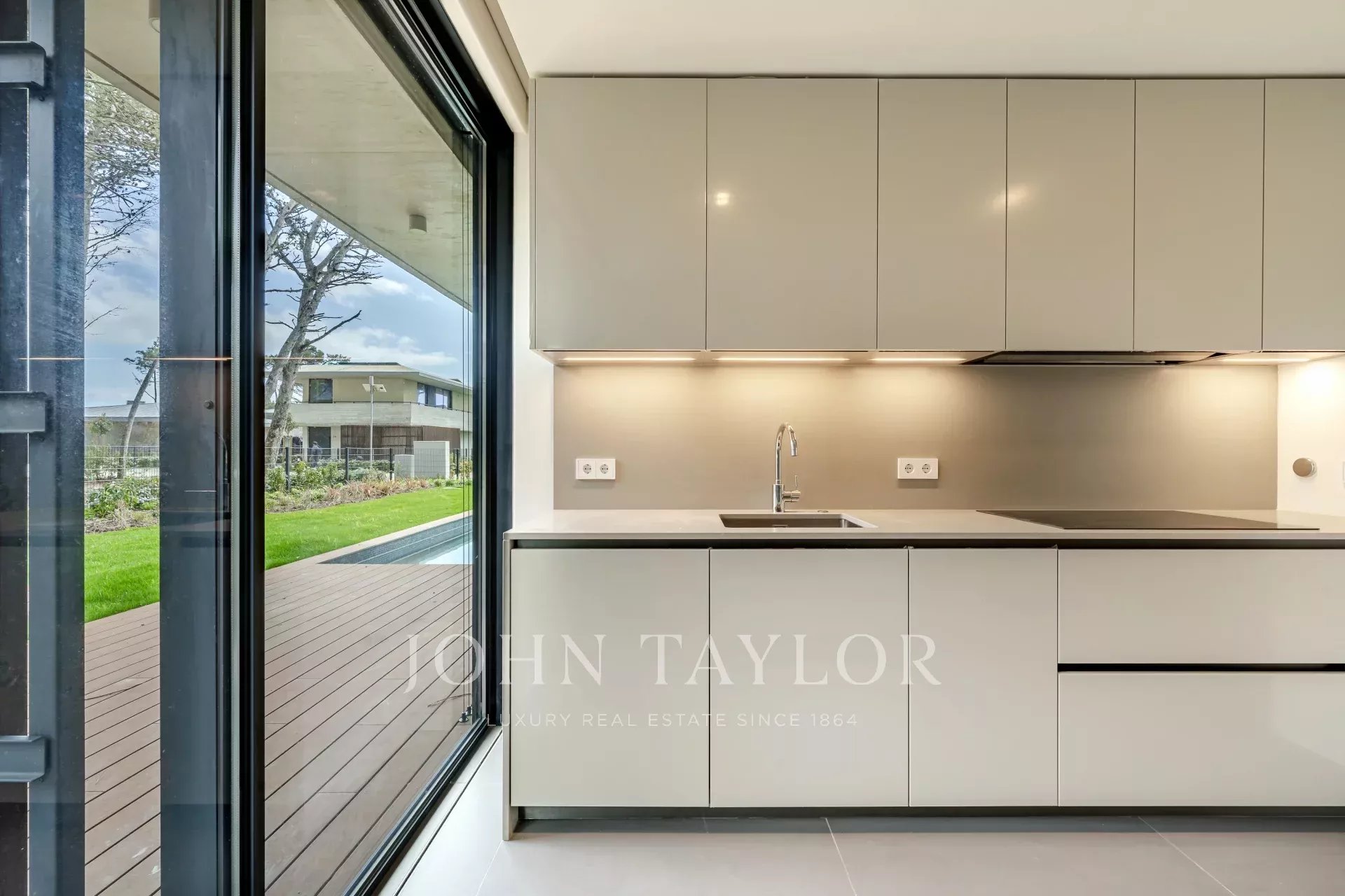 На первом этаже находится просторная гостиная и столовая открытой планировки площадью 48 м² с прямым выходом на палубу и в сад, обеспечивая плавный переход между внутренним и внешним пространством. На этом уровне также расположены полностью оборудованная кухня, прачечная с выходом на служебный дворик и гостевой туалет. К вилле прилагаются три частных парковочных места.