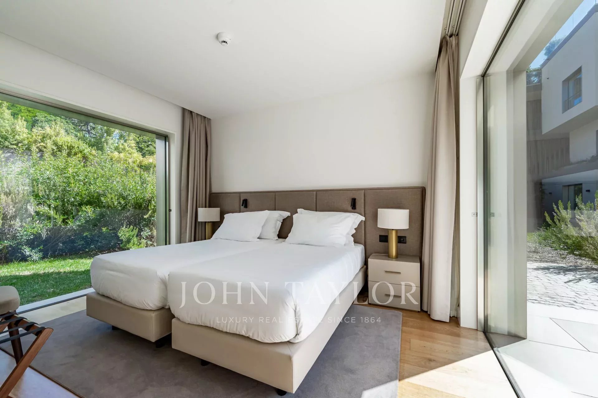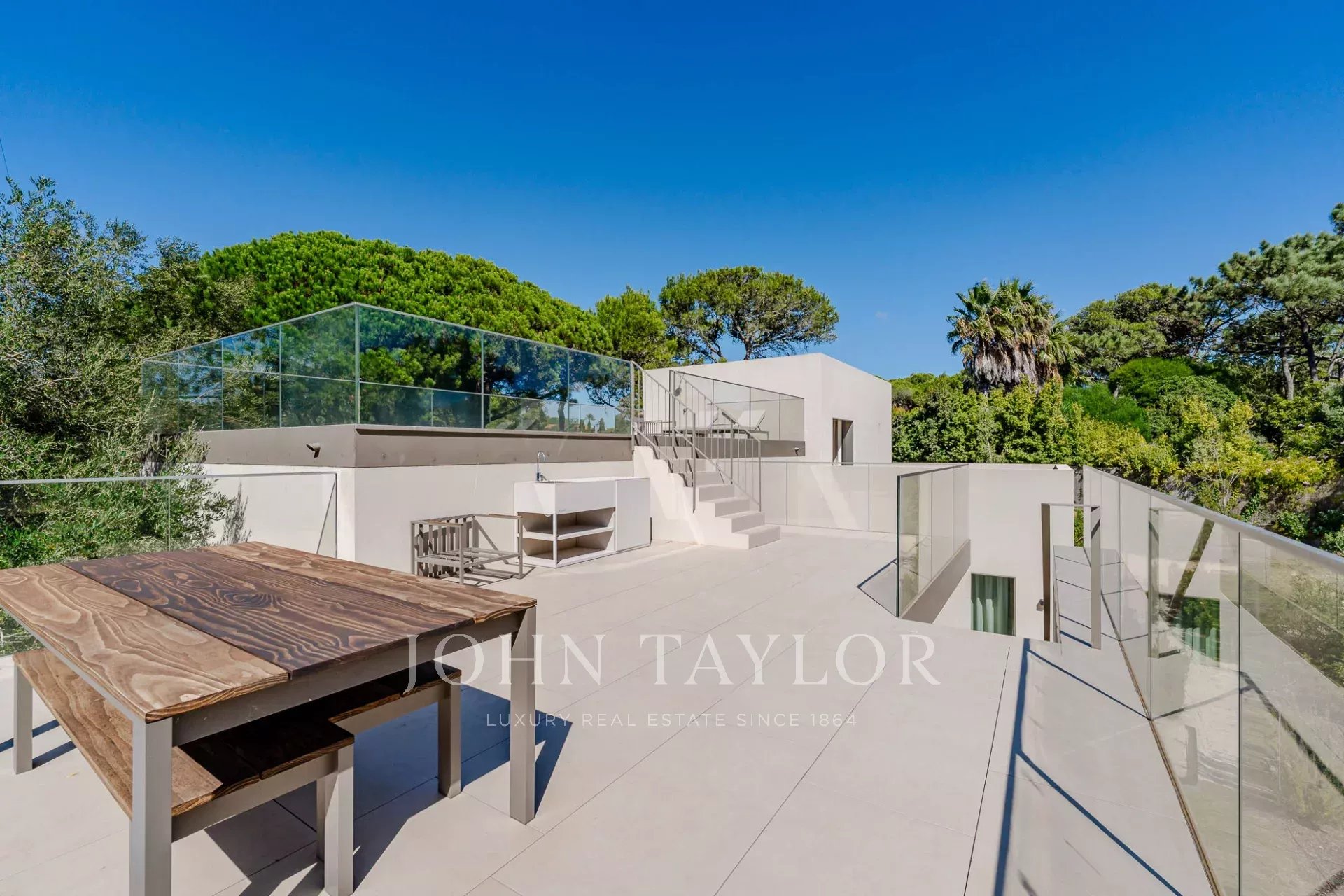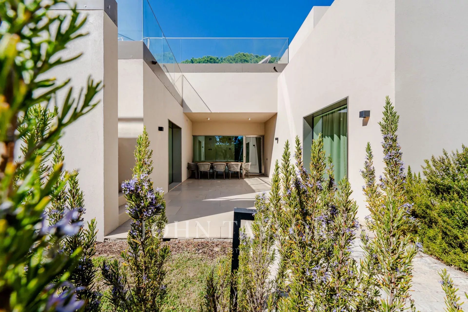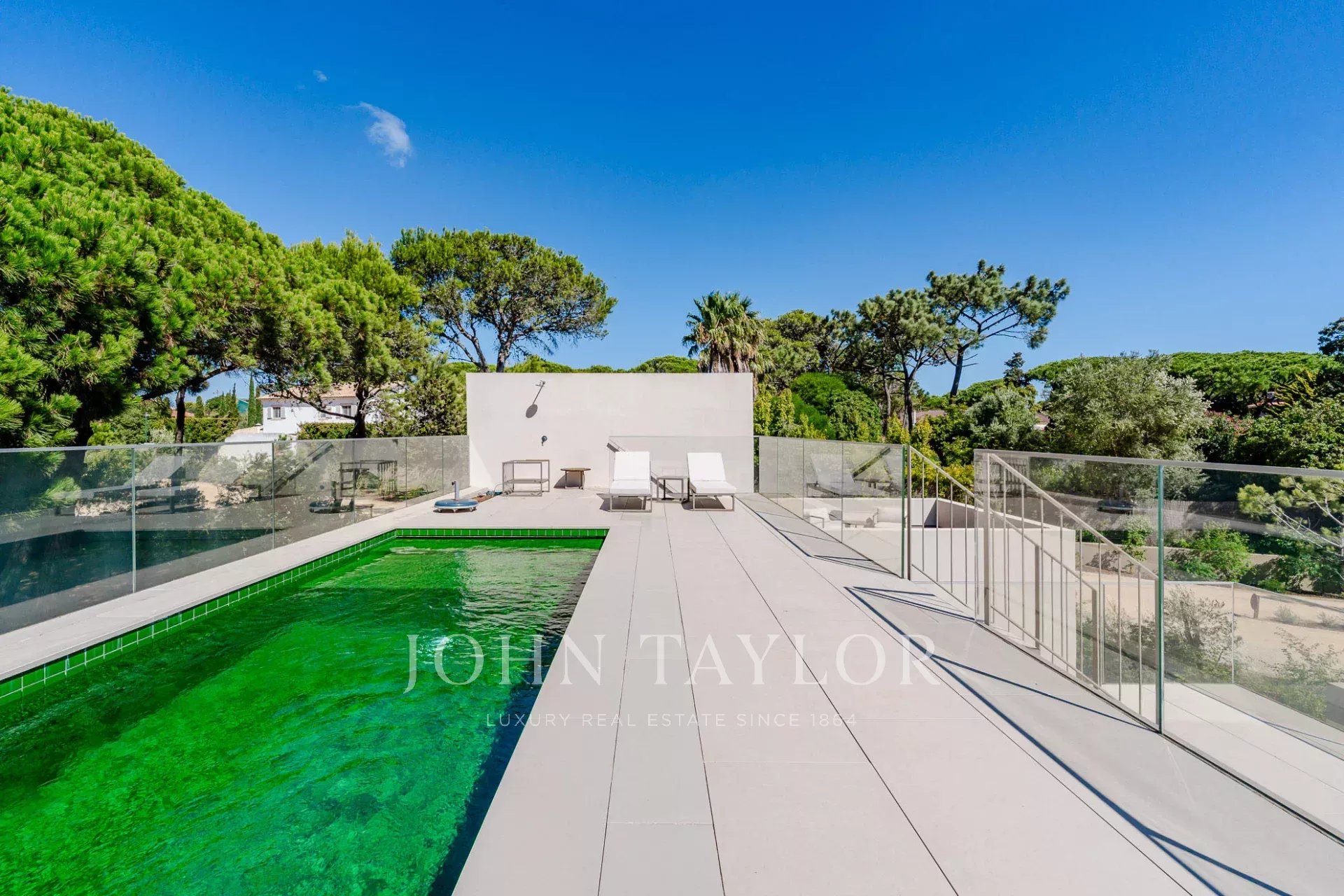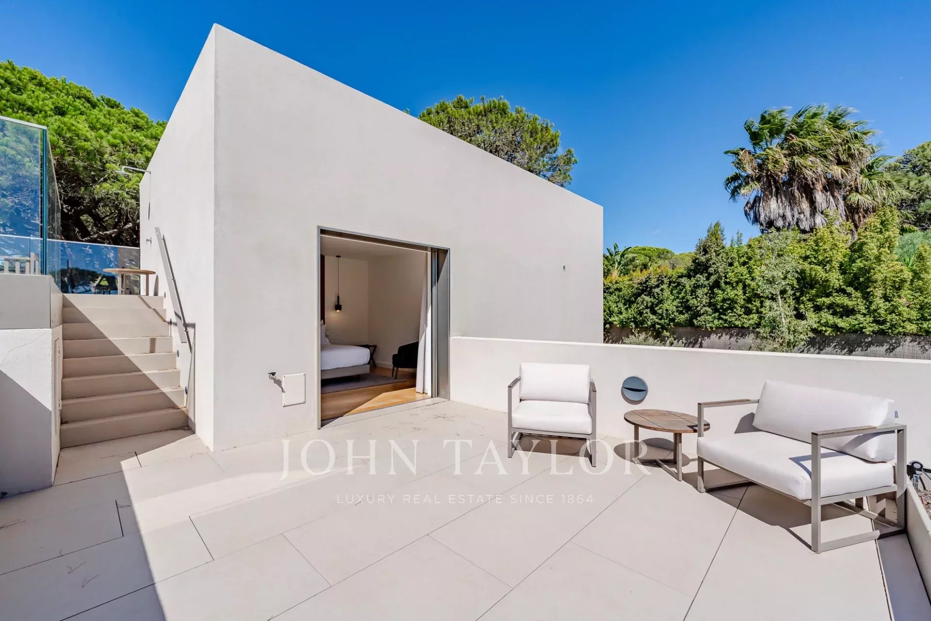 На верхнем этаже находится главная спальня с отдельным балконом и прямым выходом на террасу, где расположен бассейн.