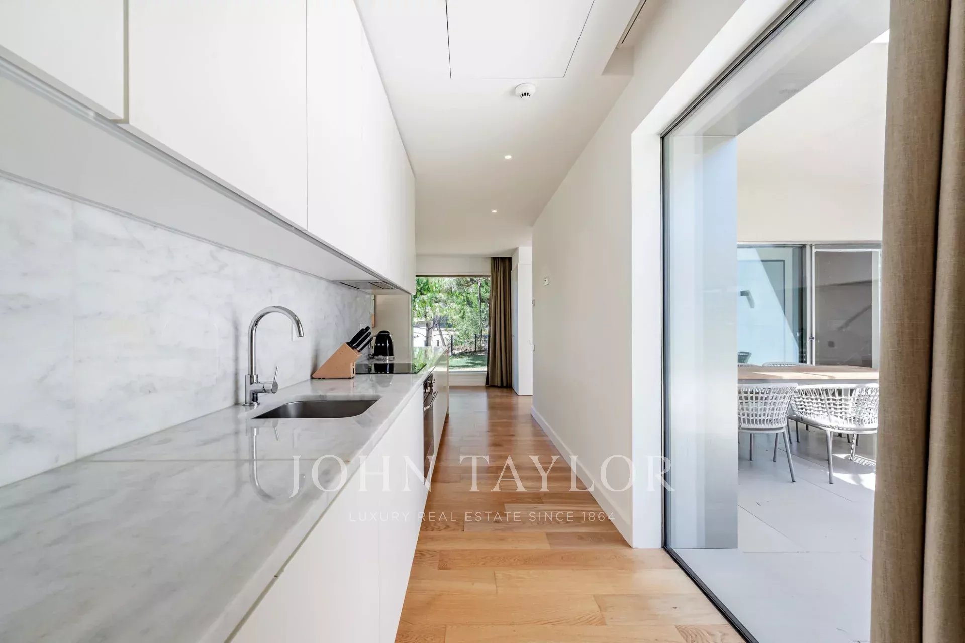 На первом этаже находится просторная гостиная и столовая, которая через большие стеклянные двери выходит прямо в сад, создавая идеальный поток между внутренним и внешним пространством. Полностью оборудованная кухня, гостевая ванная комната и две уютные спальни с ванными комнатами завершают этот уровень.