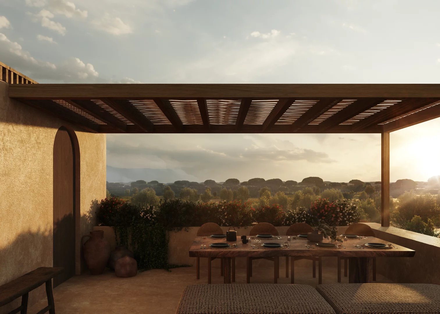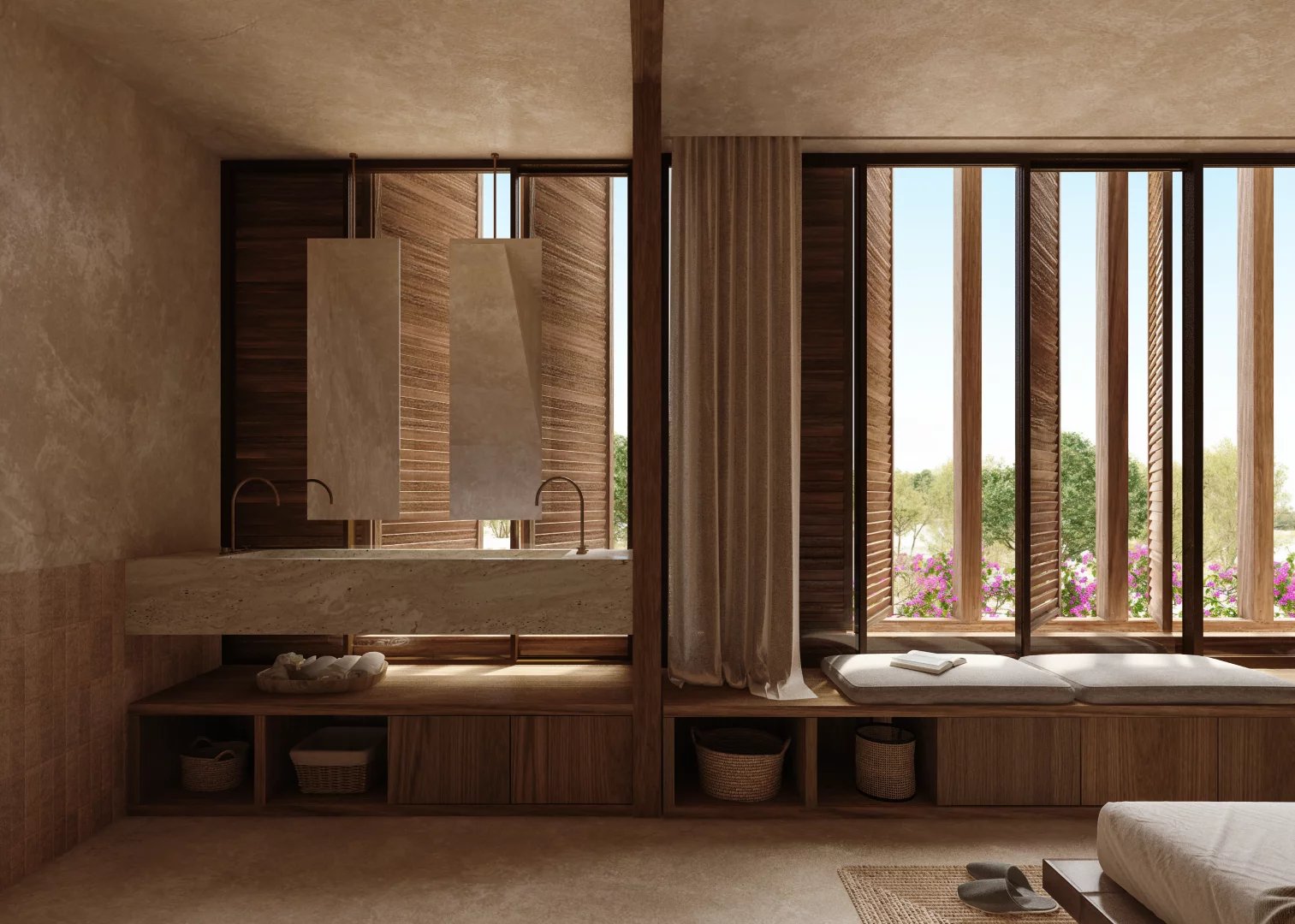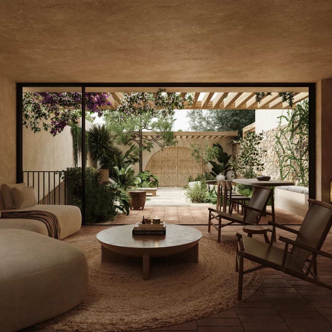 Архитектура комплекса сдержанна и изысканна, она призвана естественно вписаться в окружающий ландшафт. Натуральные материалы, такие как дерево, камень и глина, используются повсюду, создавая теплые, элегантные интерьеры с сильной связью с внешним миром.