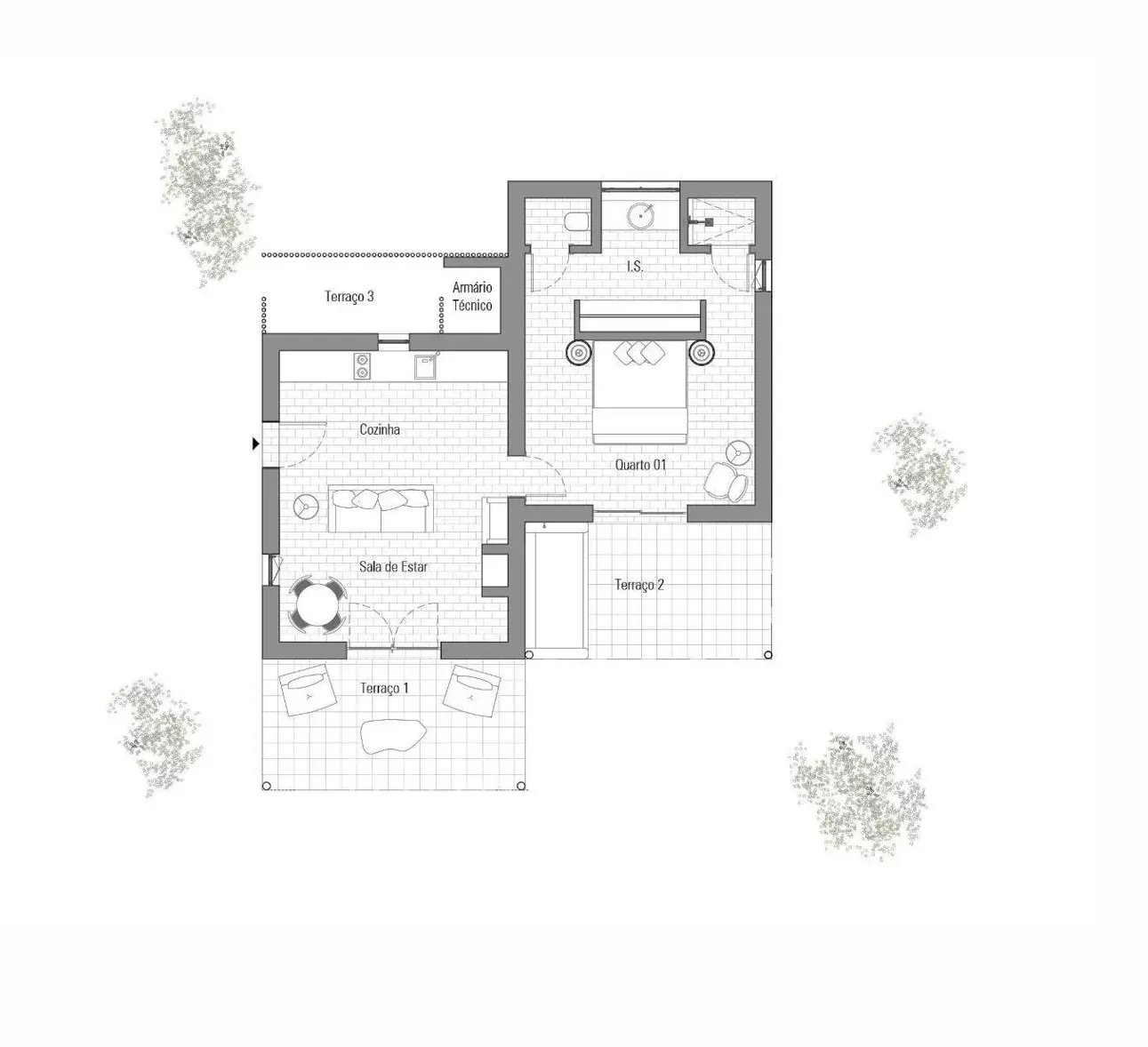 Дом включает в себя кухню, гостиную и спальню, а также имеет доступ к общему бассейну, которым пользуется группа из четырех домов. В дизайне сделан акцент на жизнь внутри и снаружи, а большие стеклянные двери выходят на затененную палубу. Окруженный соснами, местной растительностью и песчаными дорожками, дом обеспечивает уединение и тесную связь с природой.