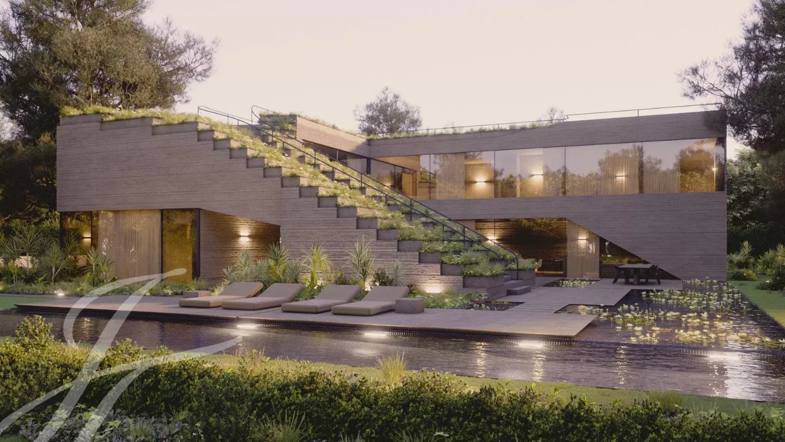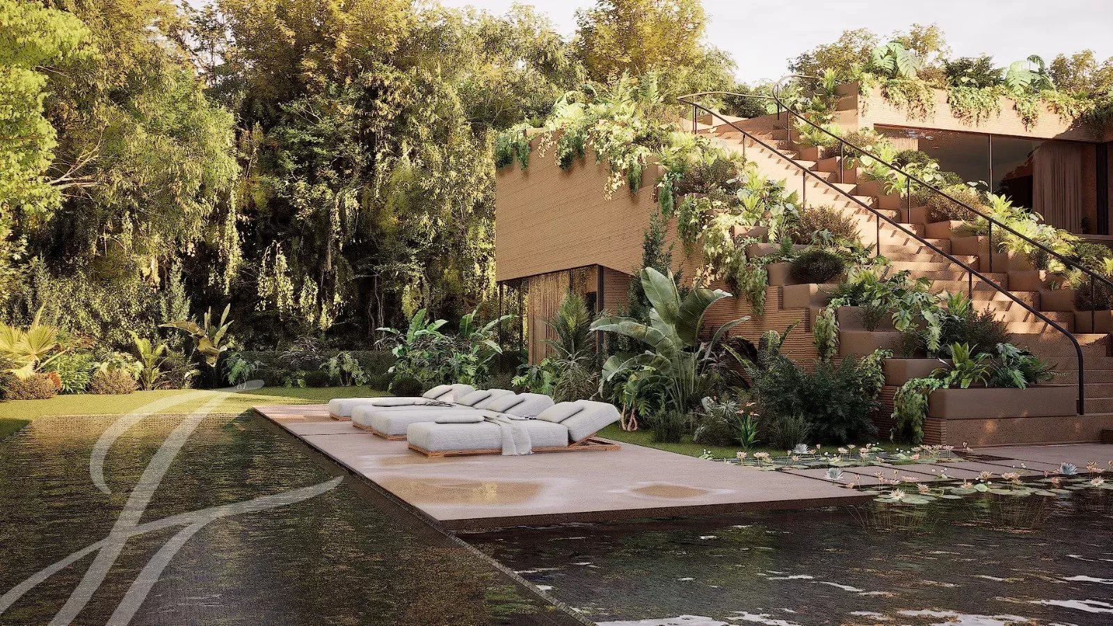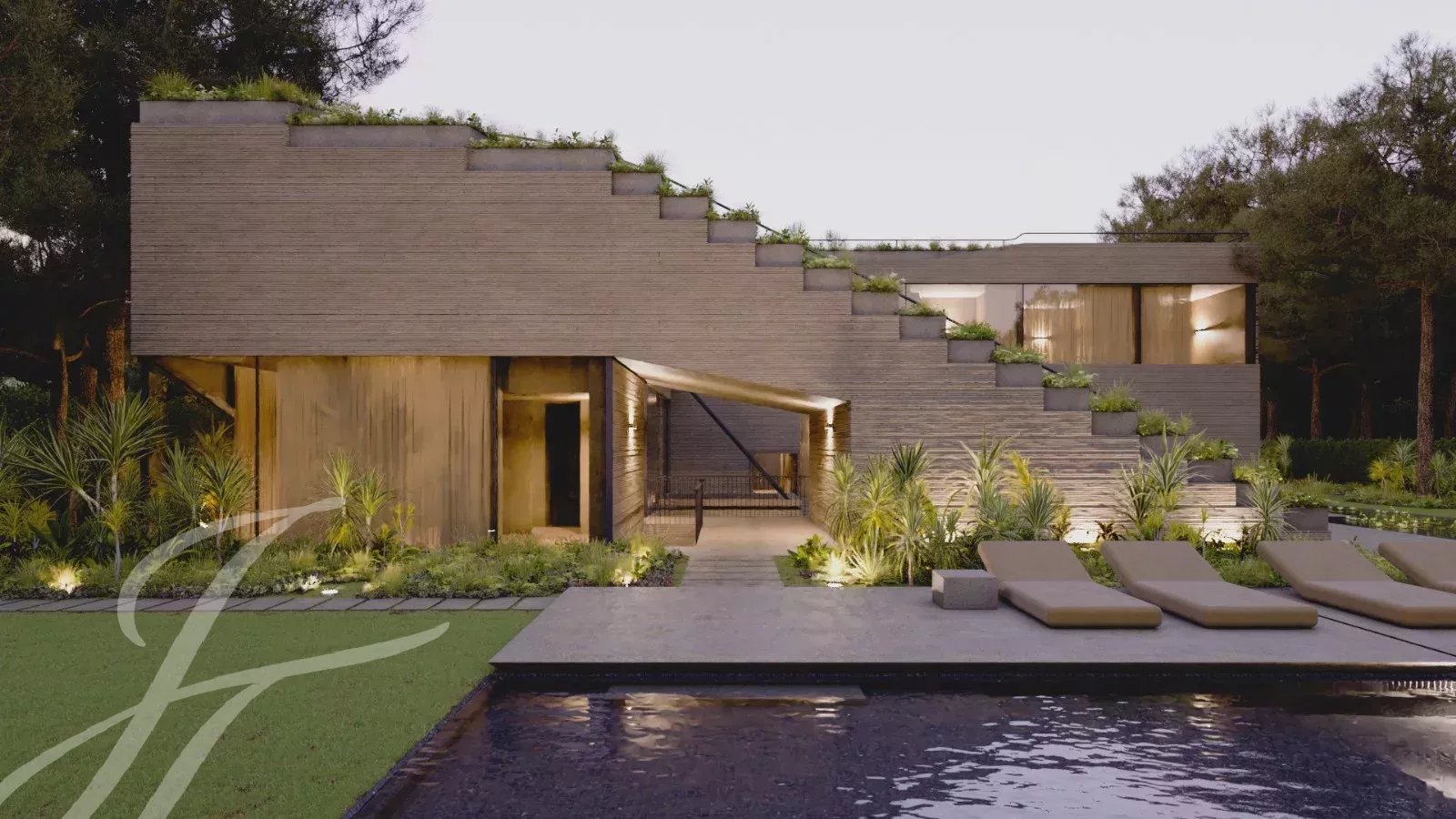 Внешний вид "Бесконечного дома" представляет собой настоящий оазис с ландшафтным садом вокруг бассейна и панорамной террасой на крыше, откуда открывается невероятный вид на окружающую природу.