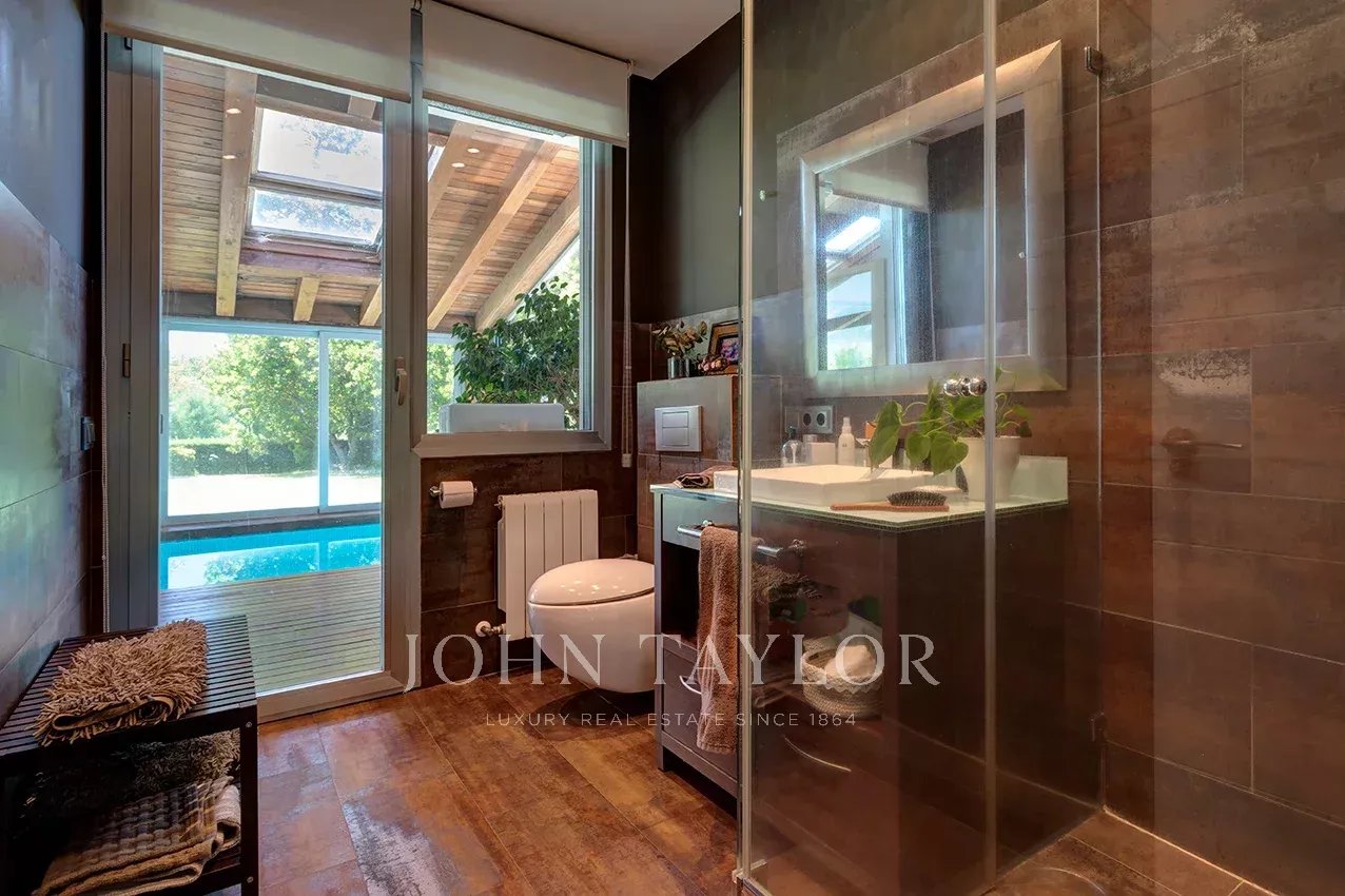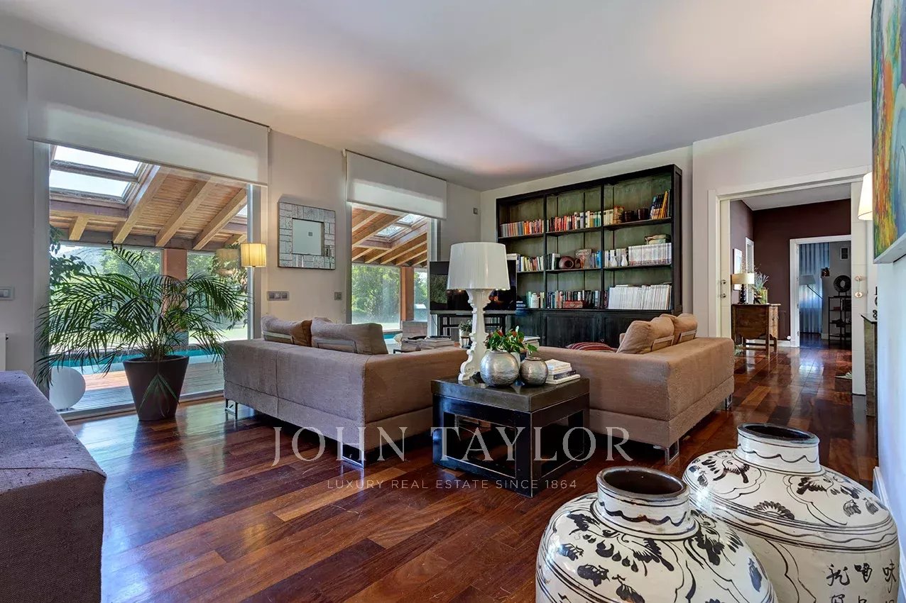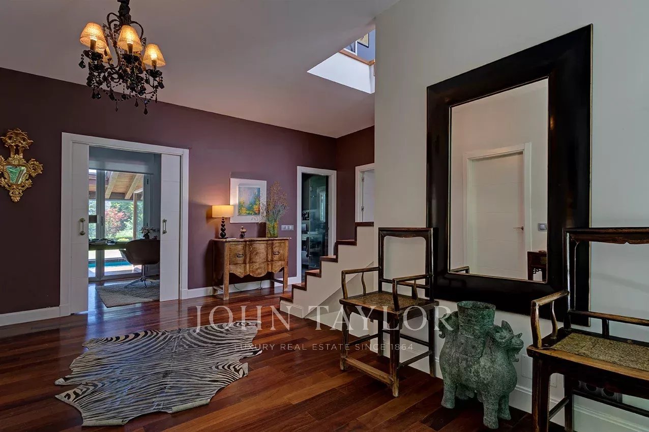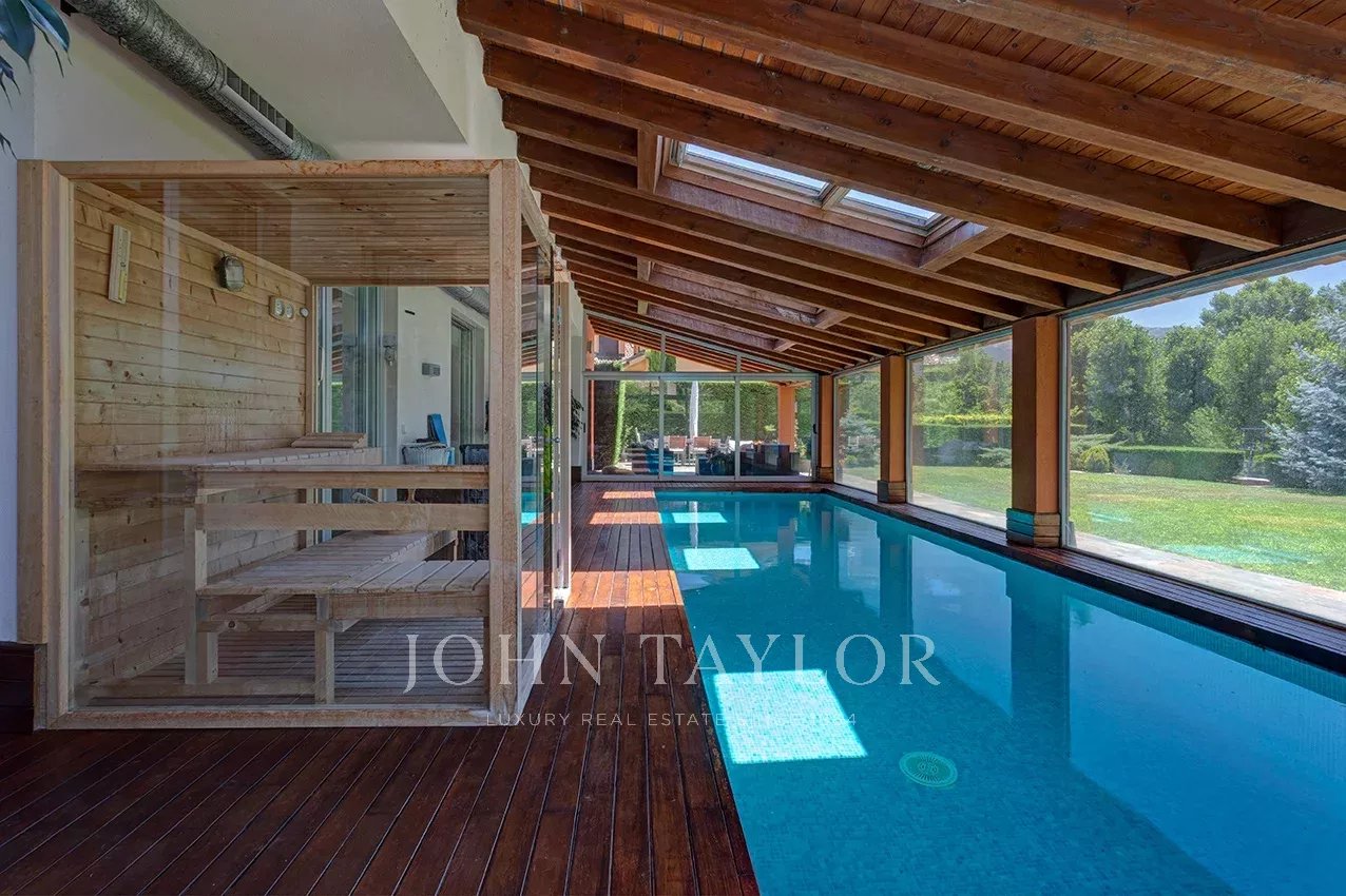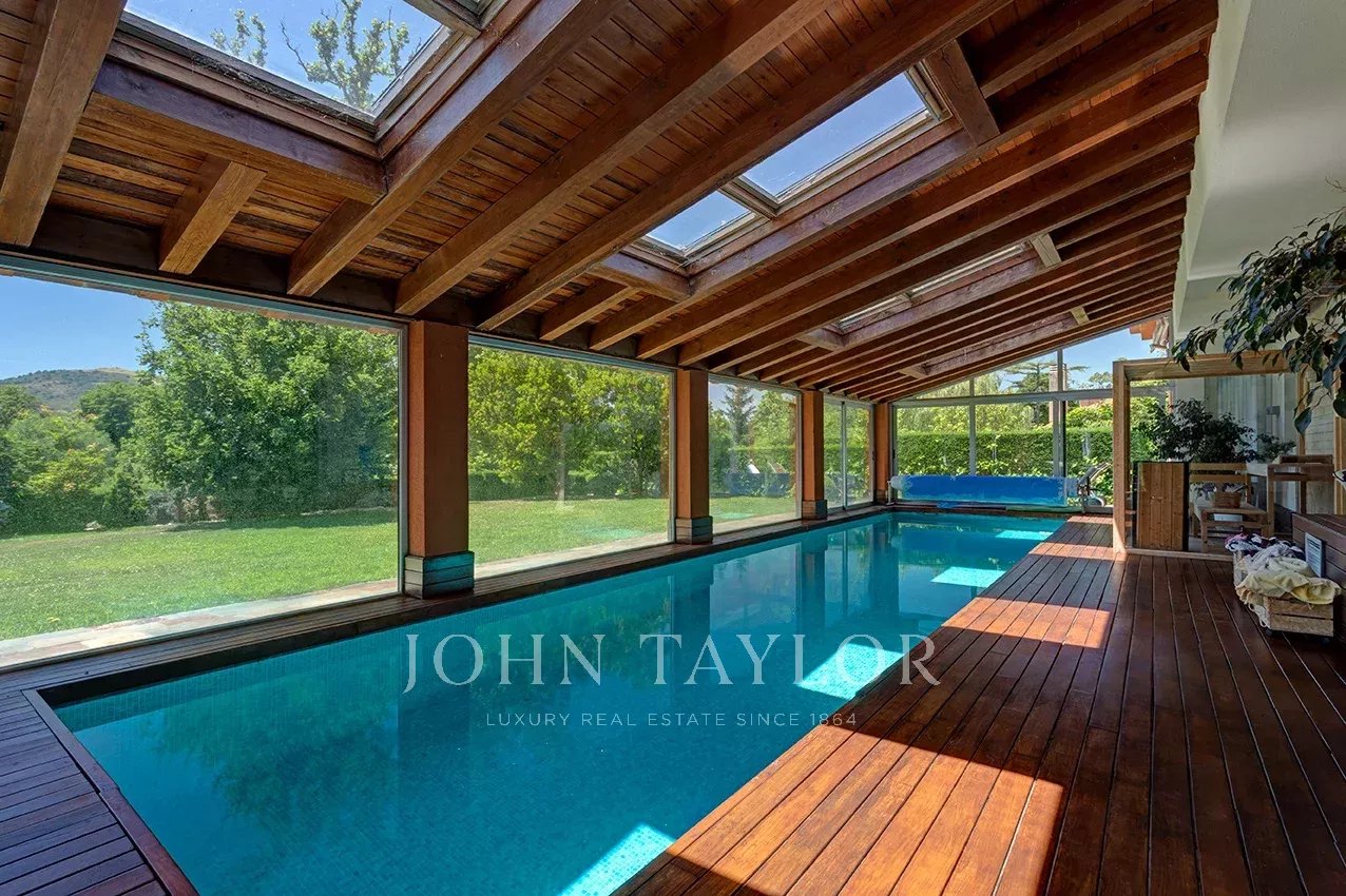 Главный этаж состоит из большой и светлой гостиной с камином и большими окнами с выходом в сад и к великолепному крытому и застекленному бассейну с подогревом и системой осушения, который летом может быть полуэкстерьером, чтобы иметь возможность открыть все застекленное ограждение.