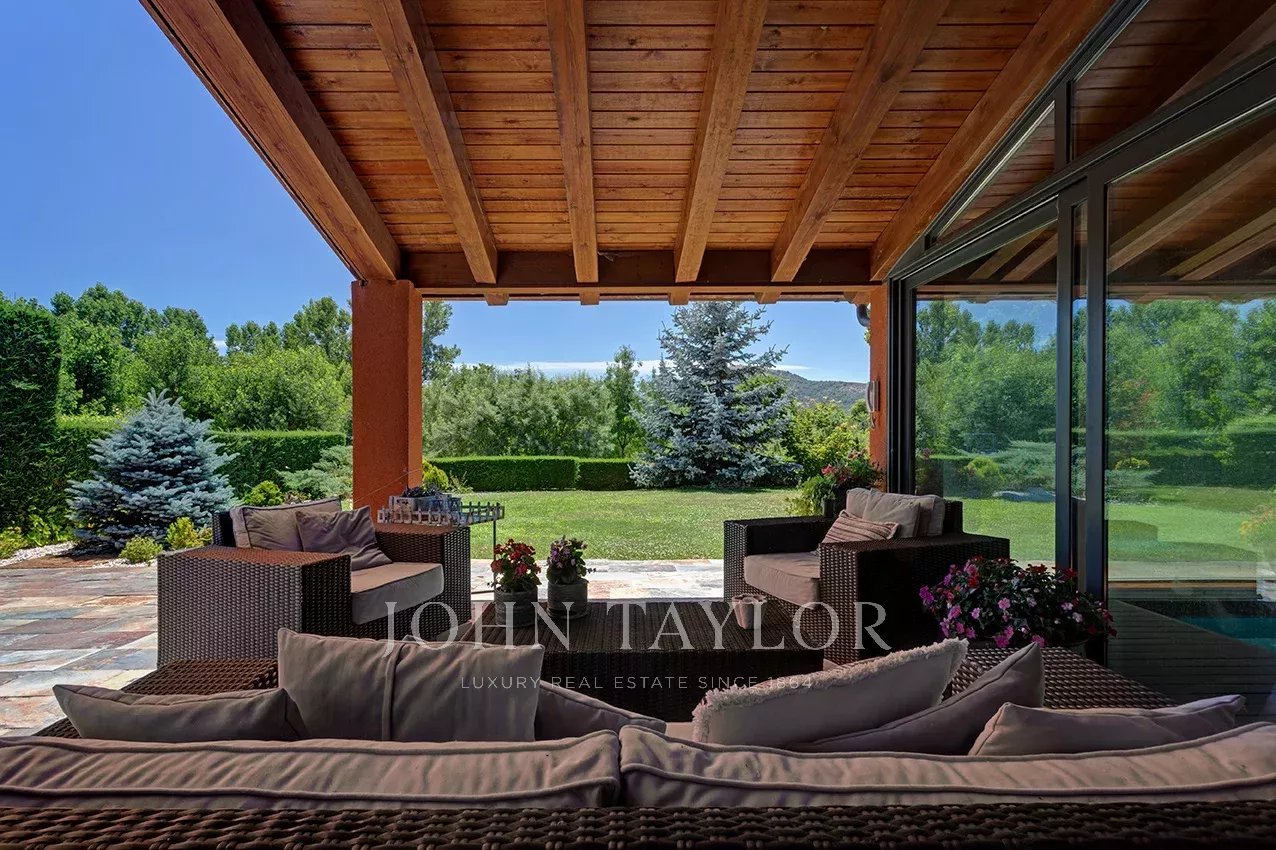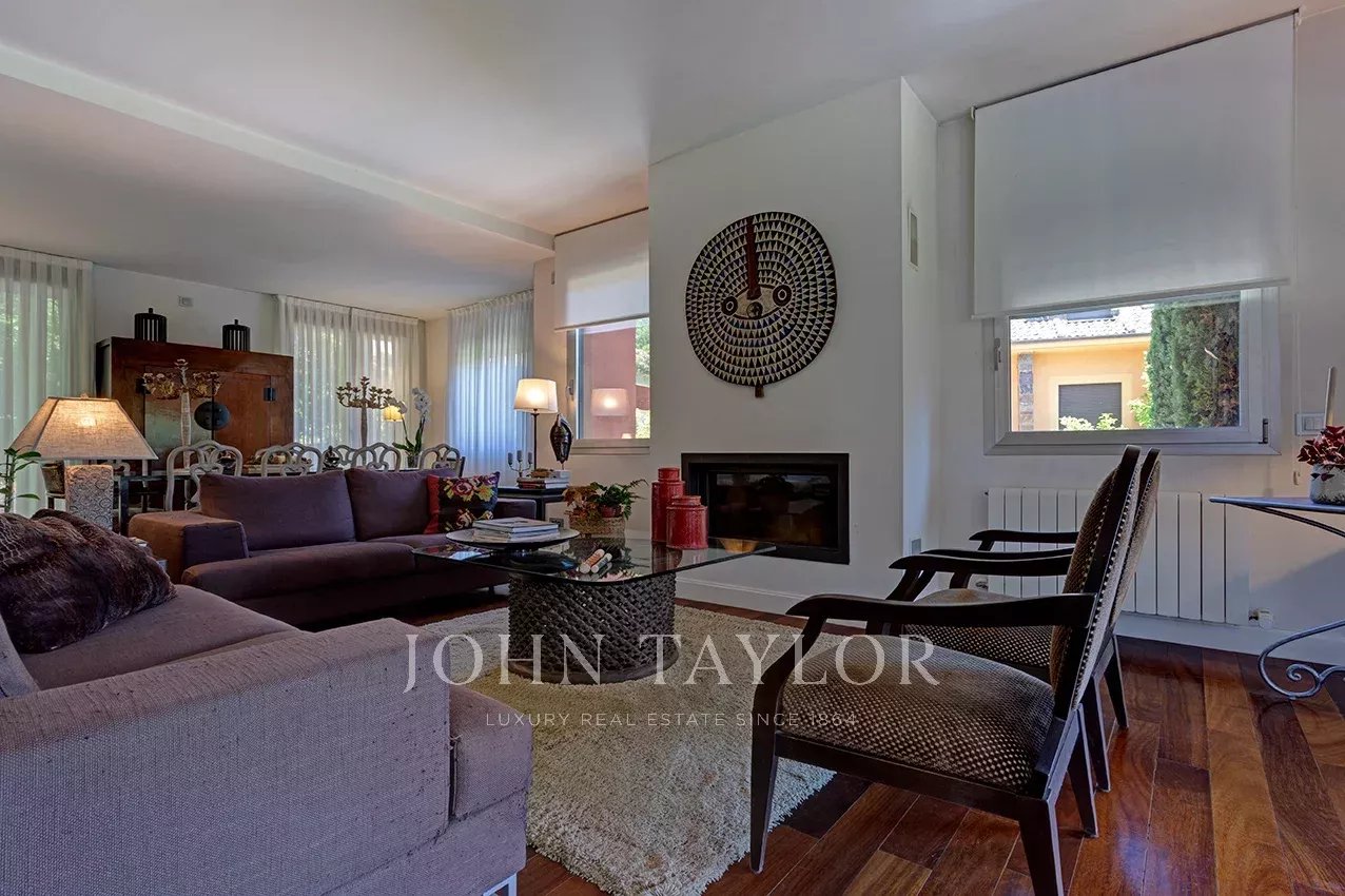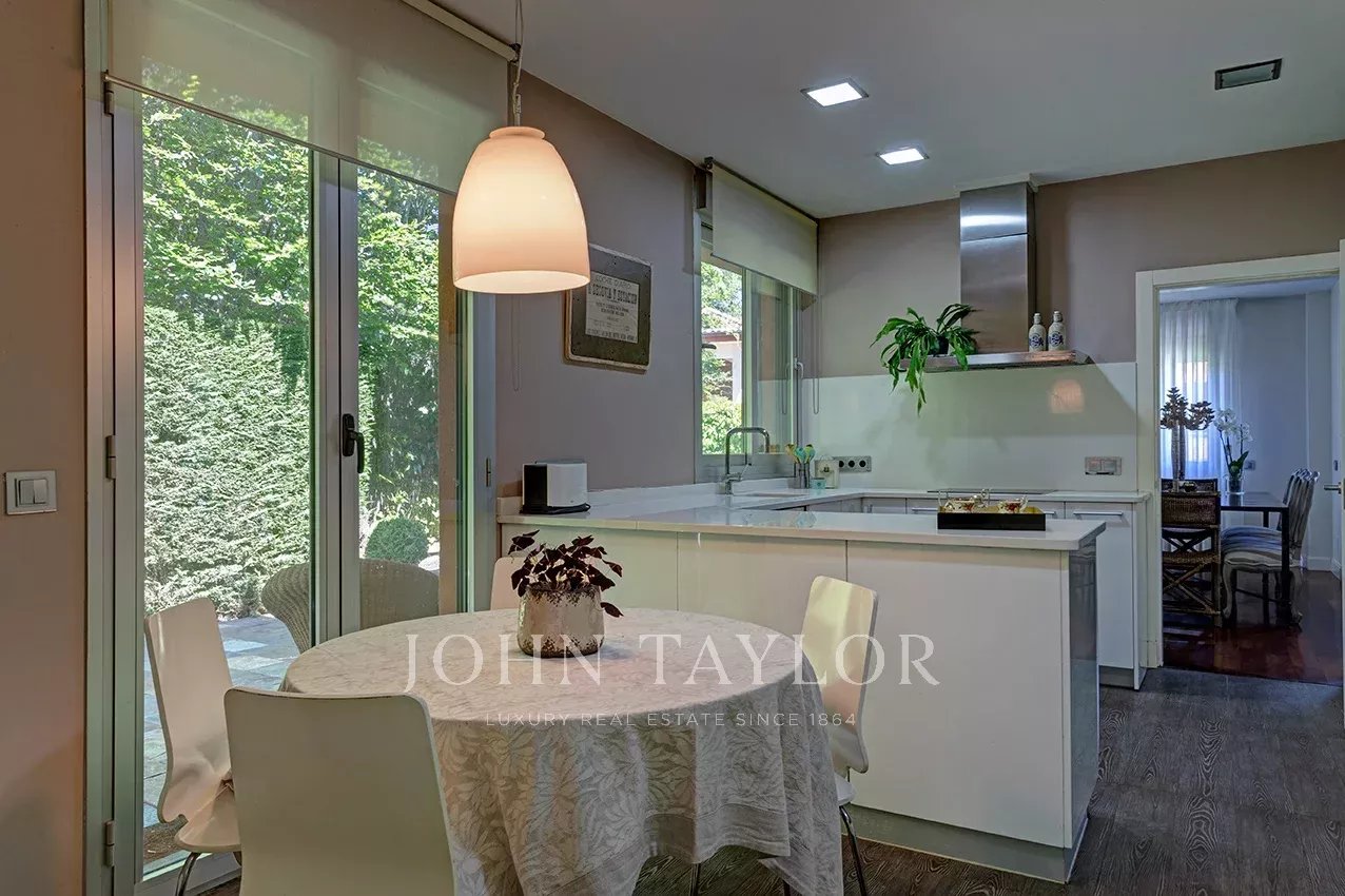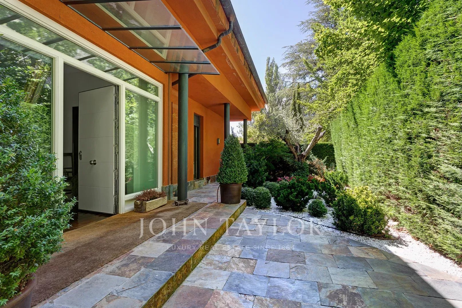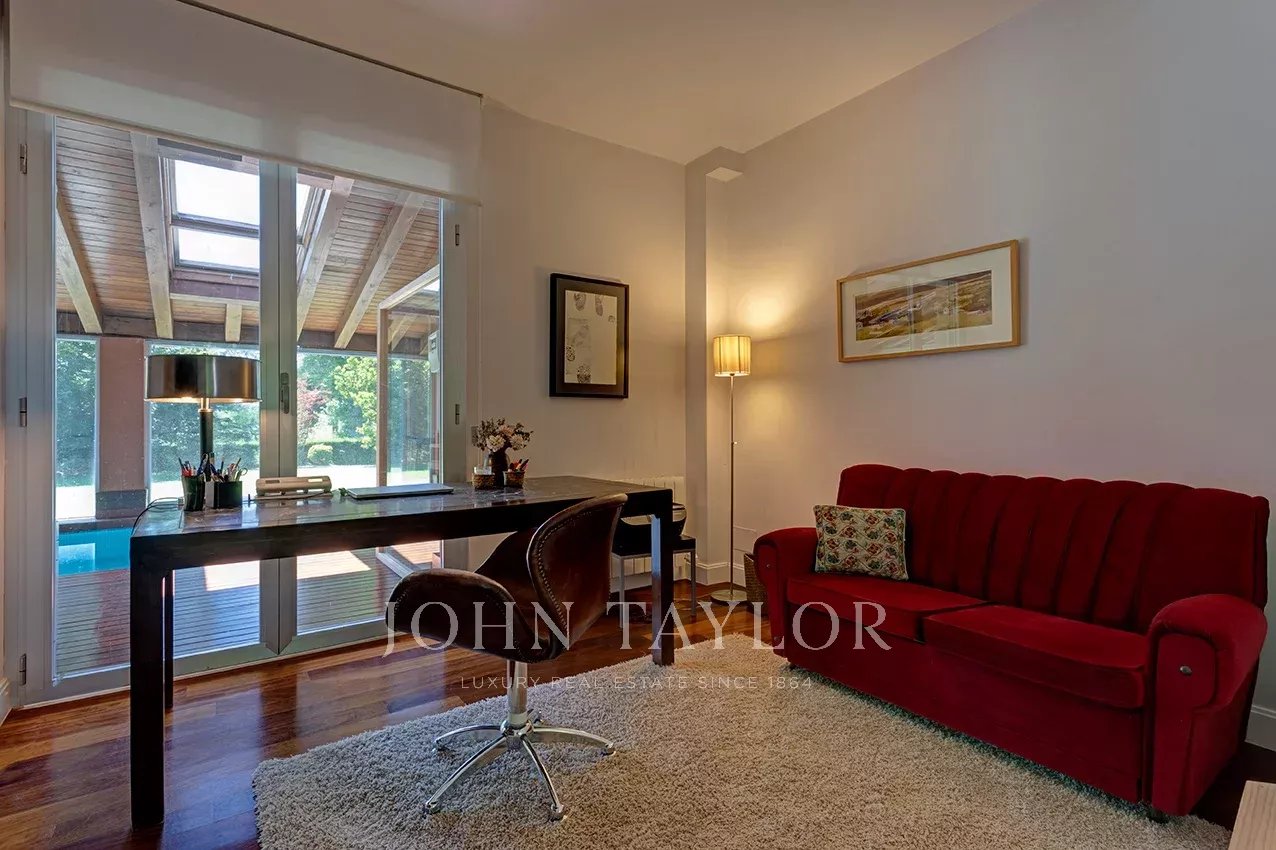 Главный этаж состоит из большой и светлой гостиной с камином и большими окнами с выходом в сад и к великолепному крытому и застекленному бассейну с подогревом и системой осушения, который летом может быть полуэкстерьером, чтобы иметь возможность открыть все застекленное ограждение.