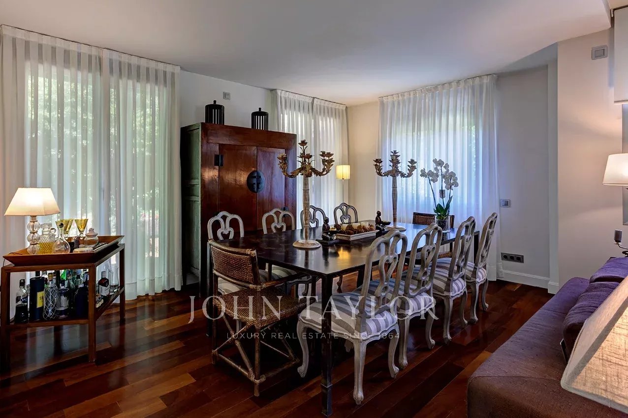 На первом этаже, с которого можно выйти в часть сада, очень светло и он состоит из служебной спальни, полной ванной комнаты, прачечной-гладильной, большой многоцелевой комнаты, которую можно использовать как игровую или гимнастический зал, четырех подсобных помещений и гаража на 3 машины.