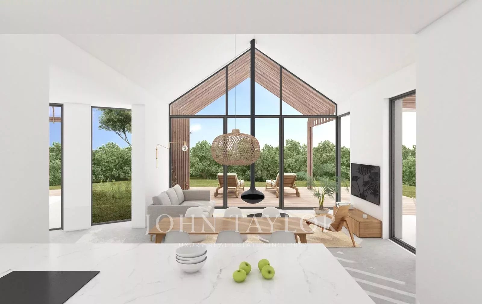 Предложенный дизайн отличается чистыми современными линиями, большими окнами и натуральными материалами, которые идеально сочетаются с ландшафтом. Планировка включает 4 спальни, светлые жилые помещения открытой планировки и просторные открытые площадки с достаточным пространством для бассейна и зон отдыха.