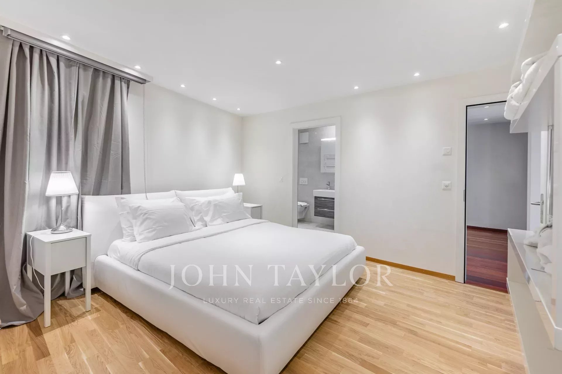 Есть 2 спальни с ванными комнатами и 1 спальня с гардеробной.