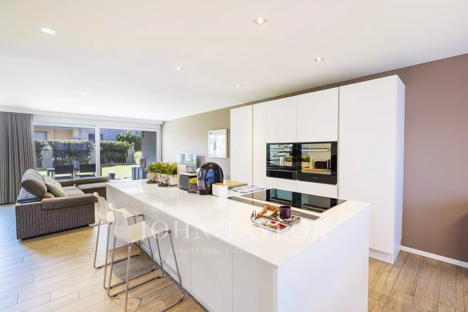 Отдельный вход, столовая с выходом на первую террасу, хорошо оборудованная кухня с центральным островом, кладовая/подсобное помещение, очень светлая гостиная с выходом на вторую террасу и в прекрасный огороженный сад, гостевой туалет.