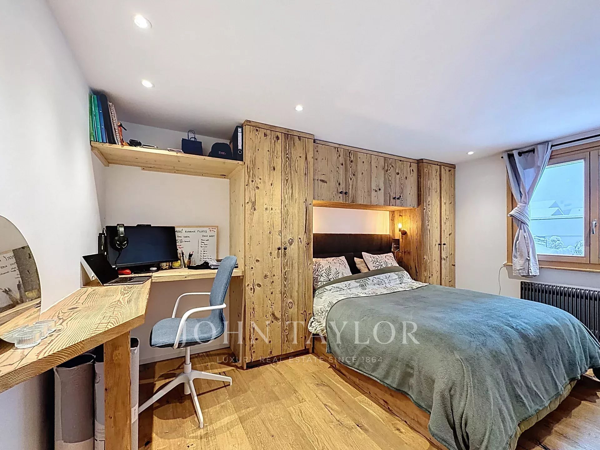 Главная спальня оформлена в стиле шале, с аккуратной деревянной отделкой, встроенными системами хранения и незаметным рабочим местом. В ванной комнате есть душевая кабина и современная отделка.